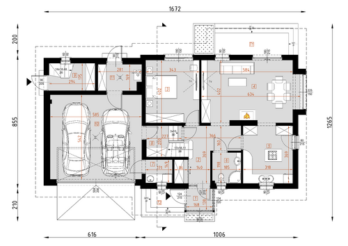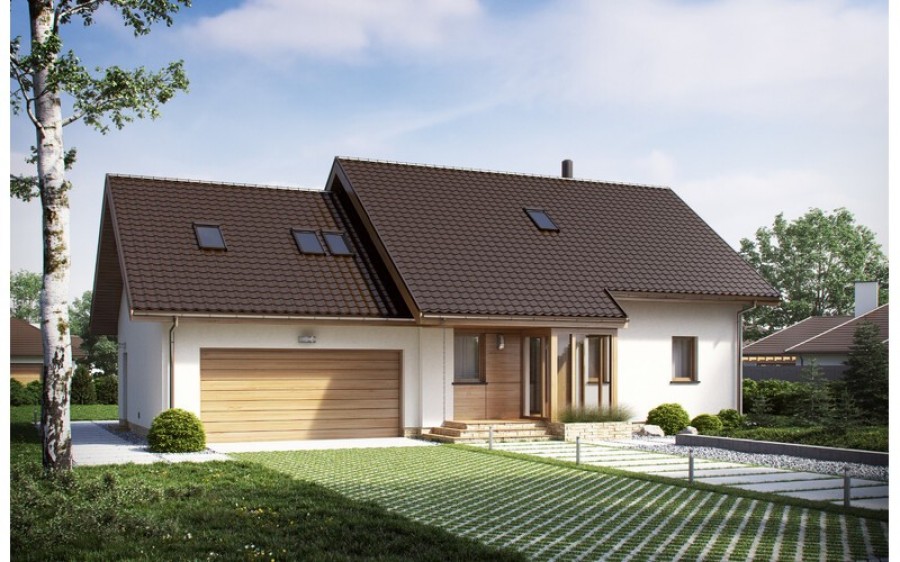 Prosta bryła budynku oraz nieskomplikowana konstrukcja wpływają na niższe koszty budowy. Bardzo funkcjonalny podział pomieszczeń z oddzielną strefą techniczną, strefą dzienną na parterze i nocną na poddaszu. Nad garażem zostało wydzielone mieszkanie.