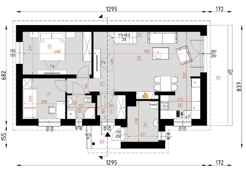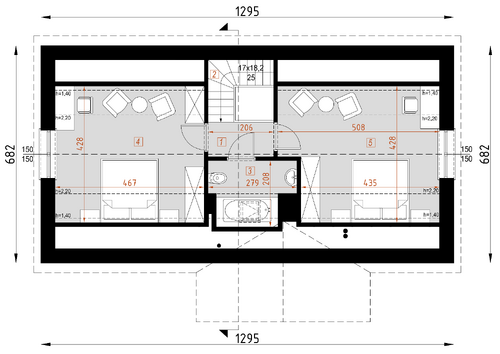D187A Szymon wersja A to niewielki, ale bardzo funkcjonalny dom jednorodzinny. Dzięki swoim wymiarom polecany na wąską działkę. Mieści aż cztery pokoje sypialne, obszerny pokój dzienny połączony z kuchnią, duże pomieszczenie techniczne oraz łazienkę. Na poddaszu znajdują się dwa pokoje sypialne i łazienka.