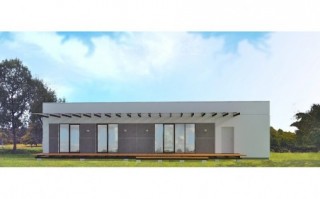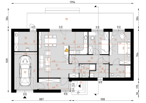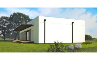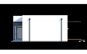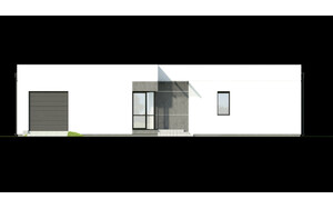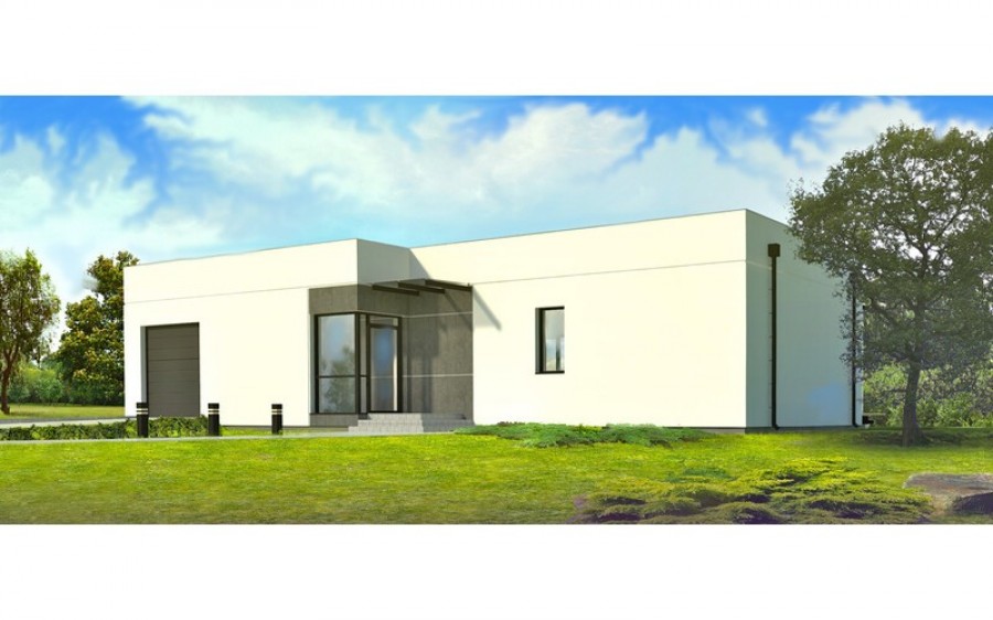 Parterowy dom z garażem w nowoczesnym stylu. Prosty i funkcjonalny, przeznaczony dla młodej rodziny z dzieckiem albo na jesień życia, może też pełnić rolę wygodnego domu letniego. Parter składa się z pokoju dziennego (z kominkiem i wyjściem do ogrodu poprzez taras), dwóch pokoi sypialnych, kuchni, łazienki, korytarza oraz przedsionka.