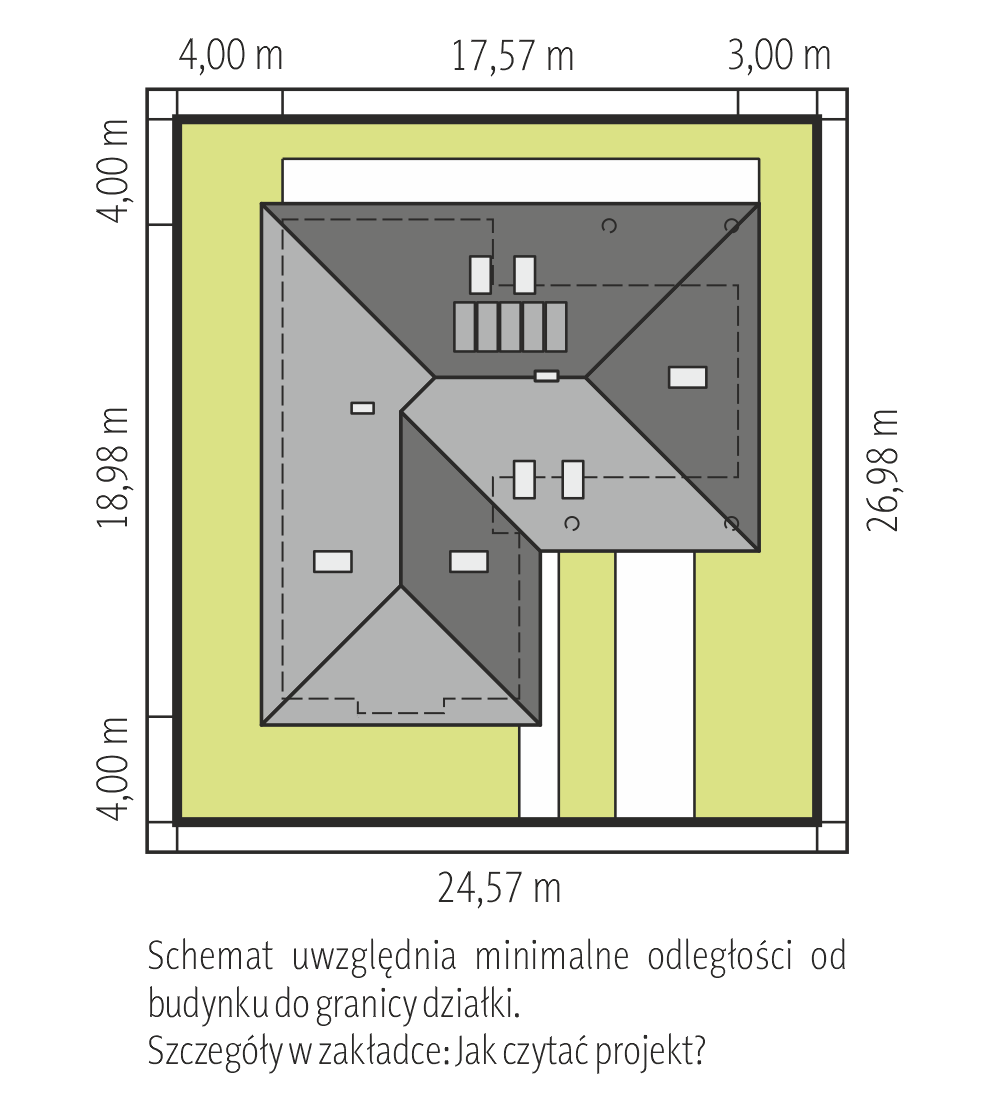 Podstawowym założeniem przyjętym przy projekcie budynku było harmonijne wpisanie się w naturalny krajobraz. W elewacji budynku poprzez materiał zaakcentowano wyraźnie, strefę wejściową. W bryle budynku oddzielono także funkcję mieszkalną dzienną od nocnej.
