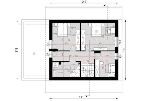 Piętro składa się z trzech sypialni, hallu i łazienki.