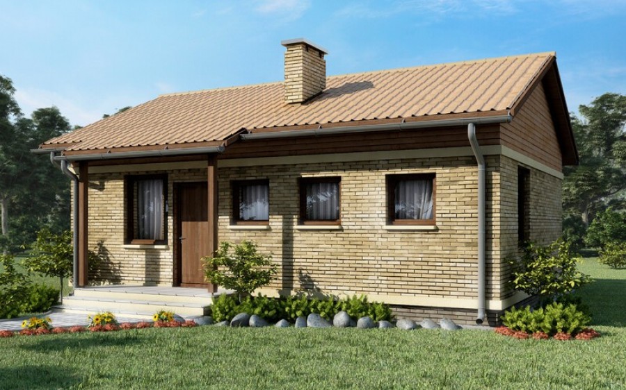 Prezentowany dom jest jednym z najtańszych w budowie i eksploatacji. Przeznaczony jest dla czteroosobowej rodziny. Może też pełnić funkcję wygodnego domu letniego. Szeroki okap dachu chroni taras przed zbytnim nasłonecznieniem jak również umożliwia korzystanie z niego podczas deszczu. Dom posiada wygodny układ funkcjonalny z podziałem na część dzienną obejmującą kuchnię, i pokój dzienny oraz część nocną z pokojami sypialnymi i łazienką. Możliwe jest oddzielenie kuchni od pokoju dziennego. Od strony sypialni możliwa jest dobudowa garażu lub wiaty na samochód. Możliwe jest ogrzewanie domu kominkiem w oparciu o system kanałów rozprowadzających ciepłe powietrze i centrali rozdzielczej.