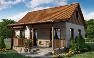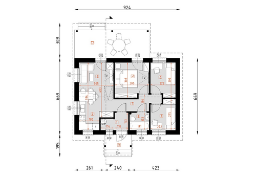 Dom mieszkalny jednorodzinny, wolno stojący, nie podpiwniczony. Z zadaszonym tarasem. Po wejściu do domu, poprzez małą sień, w której umieszczone jest również wejście do pomieszczenia technicznego, dostajemy się do hallu, z niego zaś dostępne są wszystkie inne pomieszczenia: trzy pokoje, łazienka, kuchnia i aneks jadalny. W domu występuje wyraźny podział na strefę dzienna i nocną. Na strych dostać się możemy po składanych schodach umieszczonych w pomieszczeniu jadalnianym