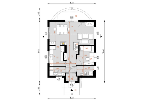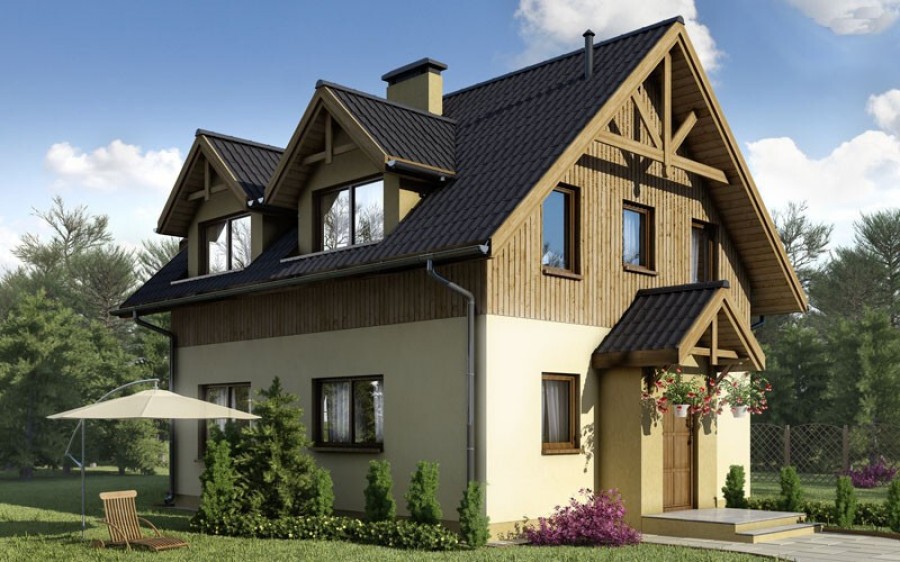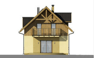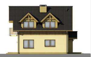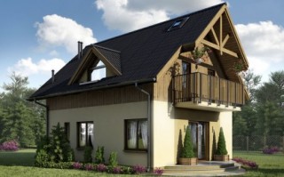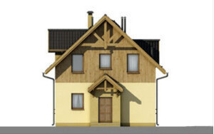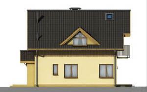 Budynek jednorodzinny z poddaszem użytkowym i dużym tarasem od strony ogrodu.Po wejściu do domu znajdujemy się w małej sieni, z której przechodzimy do hallu z widokiem na duże okna w salonie. Na uwagę zasługuje fakt, że centralnie umieszczony komin wraz z ciągiem kuchennym można obejść dookoła, co jest bardzo cenne w odbiorze przestrzennym domu. Z hall-u bezpośrednio możemy dostać się do pomieszczenia technicznego, kuchni, pokoju, łazienki. Możemy również klatką schodową wejść na piętro, gdzie znajdują się dwie obszerne sypialnie jednoosobowe i łazienka, oraz sypialnia dwuosobowa oraz oddzielna garderoba.