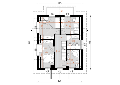 Po wejściu do domu znajdujemy się w małej sieni, z której przechodzimy do hallu z widokiem na duże okna w salonie. Na uwagę zasługuje fakt, że centralnie umieszczony komin wraz z ciągiem kuchennym można obejść dookoła, co jest bardzo cenne w odbiorze przestrzennym domu. Z hall-u bezpośrednio możemy dostać się do pomieszczenia technicznego, kuchni, pokoju, łazienki. Możemy również klatką schodową wejść na piętro, gdzie znajdują się dwie obszerne sypialnie jednoosobowe i łazienka, oraz sypialnia dwuosobowa oraz oddzielna garderoba.