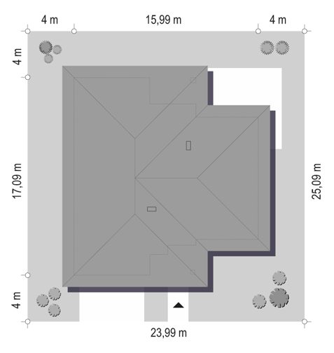Dom parterowy, niepodpiwniczony, przeznaczony dla 4-5-osobowej rodziny. W części ogólnodostępnej znajduje się przestronny hall oraz pokój dzienny połączony z jadalnią i kuchnią. Istnieje możliwość wydzielenia osobnej kuchni. W odizolowanej części prywatnej zlokalizowano dwie sypialnie z ogólnodostępną łazienką oraz dodatkową sypialnię z własną łazienką. Przy strefie wejściowej znajduje się pomieszczenie gospodarcze(kotłownia) oraz dwustanowiskowy garaż.