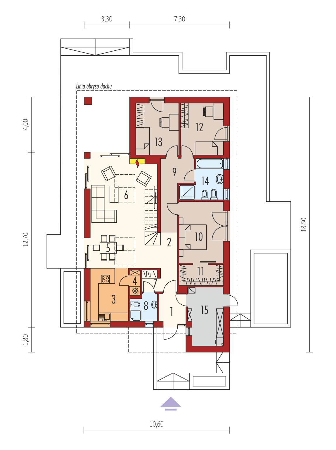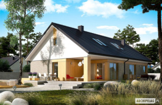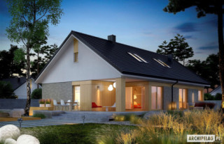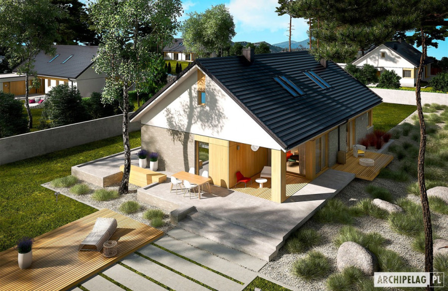 Więźba dachowa w systemie prefabrykacji drewnianej w systemie płytki kolczastej MITEK. Charakterystyka: Dom parterowy z poddaszem do późniejszej adaptacji, niepodpiwniczony Przeznaczenie: Dom dla 3-4-osobowej rodziny Technologia i konstrukcja: Ściany zewnętrzne: murowane, dwuwarstwowe, pustaki ceramiczne 24 cm, ocieplenie styropian Termo Organika 20 cm Ściany wewnętrzne: nośne i działowe murowane, pustaki ceramiczne 24 cm i 12 cm Strop: strop gęstożebrowy Teriva oraz pas dolny wiązara stanowi konstrukcję Dach: więźba dachowa w systemie prefabrykacji drewnianej, ocieplenie wełna mineralna 30 cm firmy ISOVER, dachówka ceramiczna płaska typu Bergamo firmy RöbenRozwiązania instalacyjne: Ogrzewanie: kocioł gazowy kondensacyjny, rozprowadzenie ciepła: grzejniki Wentylacja: grawitacyjna Wykończenie: Elewacje: tynk cienkowarstwowy mineralny w kolorze TO-PA001 z palety firmy Termo Organika, okładzina drewniana, płytki ceramiczne elewacyjne firmy Röben Stolarka: drewniana, PVC lub aluminiowa, rolety zewnętrzne w systemie CleverBox firmy BeClever, okna połaciowe firmy Fakro, drzwi wejściowe firmy Hörmann Otoczenie: płyty tarasowe firmy Libet, system tarasowy ProDeck - deska kompozytowa Terra w kolorze orzech Wersje - zapytaj o dostępność: - Daniel – dom parterowy, podobny układ funkcjonalny, tradycyjna więźba dachowa- Daniel G1 (30 stopni) - z dachem o kącie nachylenia 30°, tradycyjna więźba dachowa, garaż jednostanowiskowy - Daniel II – dom parterowy, podobny układ funkcjonalny, tradycyjna więźba dachowa- Daniel III - dom parterowy, wysoki salon z dodatkowym doświetleniem oknami dachowymi, tradycyjna więźba dachowa- Daniel IV - z garażem jedno- lub dwustanowiskowym- Daniel V ENERGO PLUS - dom z poddaszem użytkowym, prefabrykowane wiązary dachowe, dach o kącie nachylenia 42°, instalacje energooszczędne: pompa ciepła, ogrzewanie podłogowe, wentylacja mechaniczna, system solarny- każda wersja z inną propozycją wykończenia elewacji- różne wersje garaży do każdego domu: bez garażu, z garażem jedno- i dwustanowiskowym - odbicie lustrzane do każdej wersji Istnieje techniczna możliwość: - podpiwniczenia budynku - wykonania budynku w technologii szkieletowej