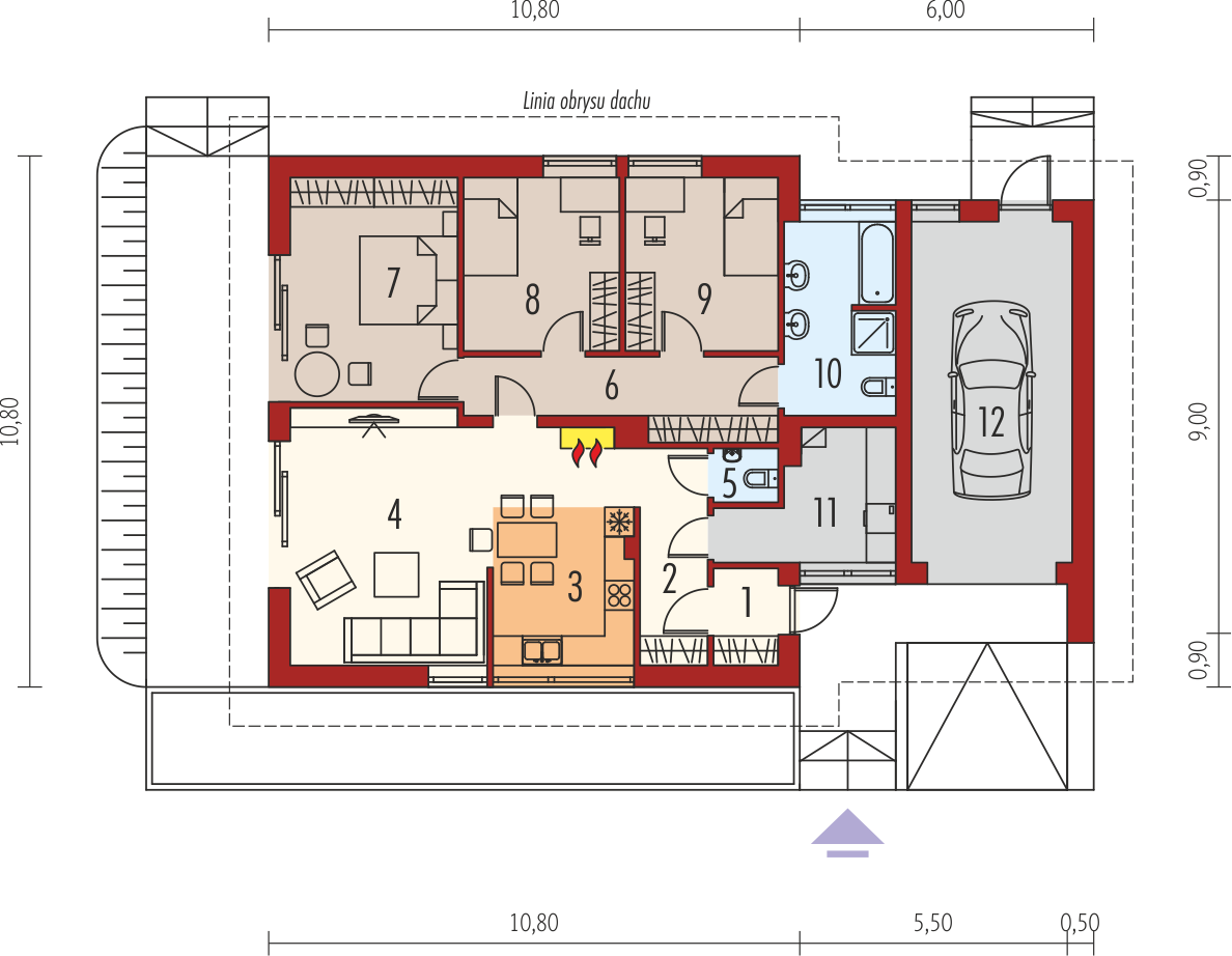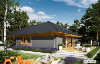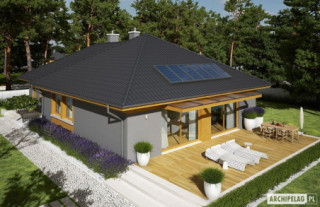 Charakterystyka: dom parterowy, niepodpiwniczony, z garażem jednostanowiskowymPrzeznaczenie: dom dla 3-4-osobowej rodziny Technologia i konstrukcja:Fundamenty: ławy, bloczki betonowe 24 cm, ocieplenie styropian 15 cmŚciany zewnętrzne: murowane, dwuwarstwowe, beton komórkowy firmy Solbet 24 cm, ocieplenie styropian Termo Organika 20 cmŚciany wewnętrzne: nośne i działowe murowane, beton komórkowy firmy Solbet 24 cm i 12 cmPodłoga na gruncie: płyta betonowa, ocieplenie styropian 15 cmStrop: strop gęstożebrowy Teriva, ocieplenie wełna mineralna firmy Isover 30 cmDach: konstrukcja drewniana, dachówka ceramiczna lub cementowa Rozwiązania instalacje:Ogrzewanie: kocioł gazowy kondensacyjny firmy Viessmann, rozprowadzenie ciepła: grzejniki firmy PurmoWentylacja: grawitacyjna OZE: kolektory słoneczne firmy Viessmann Dodatkowo: stacja uzdatniania wody firmy ViessmannWykończenie:Elewacje: tynk cienkowarstwowy mineralny z palety firmy Termo Organika i okładzina z płyty HPL z naturalną okleiną drewnianą firmy ProdemaStolarka: drewniana, PCV lub aluminiowa, rolety zewnętrzne w systemie CleverBox firmy BeClever, drzwi wewnętrzne i wejściowe oraz brama garażowa firmy HörmannWersje - zapytaj o dostępność:- Dawid - bez garażu lub z garażem dwustanowiskowym- Odbicie lustrzane do każdej wersji Istnieje techniczna możliwość:- podpiwniczenia budynku- zbliźniaczenia- wykonania budynku w technologii szkieletowej Atuty projektu okiem architekta:- Zwarta bryła budynku sprzyjająca energooszczędności- Możliwość usytuowania domu na działce z wjazdem od wschodu lub od zachodu (w odbiciu lustrzanym)- Ciekawe wnętrze z podziałem na strefę dzienną i nocną- Wygodny, dobrze doświetlony salon z kominkiem- Wyjście na taras z salonu i sypialni głównej- Funkcjonalne szafy wnękowe w strefie wejściowej- Wygodne zadaszenie nad wejściem do budynku jako osłona przed wiatrem i śniegiem- Garaż oddzielony termicznie od ogrzewanej części budynku