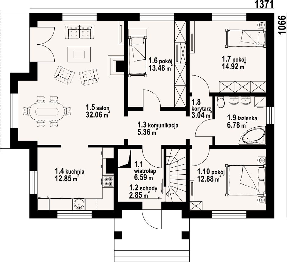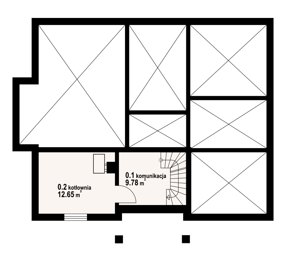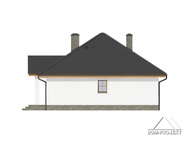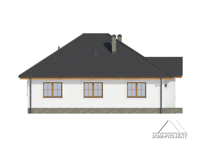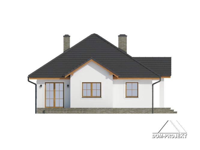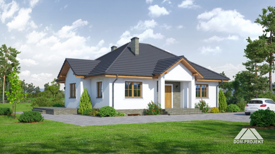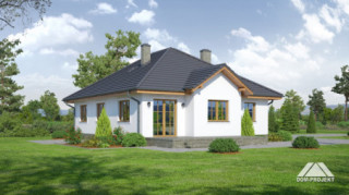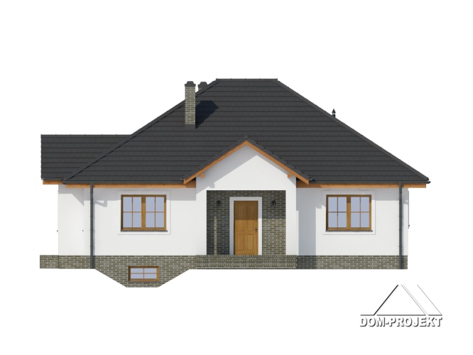 Dom parterowy częściowo podpiwniczony. Duży salon z kominkiem, wyjściem na taras i otwarciem na kuchnię. Trzy pokoje, łazienka, kotłownia, wiatrołap i komunikacja. Poddasze nieużytkowe. W podpiwniczeniu kotłownia i komunikacja.