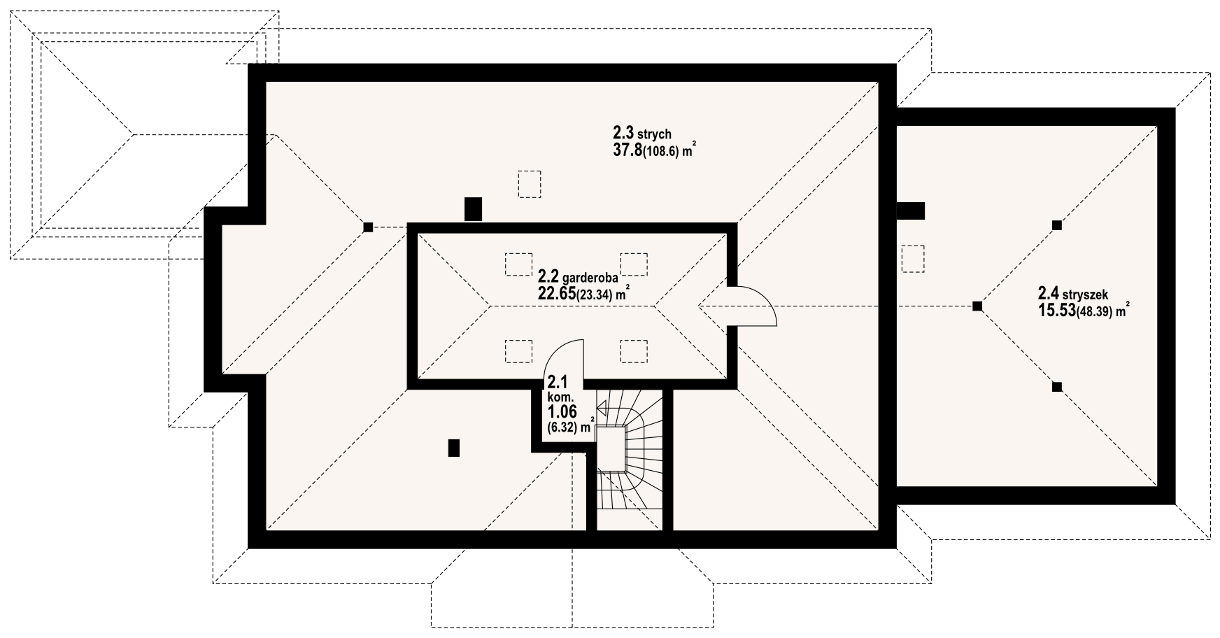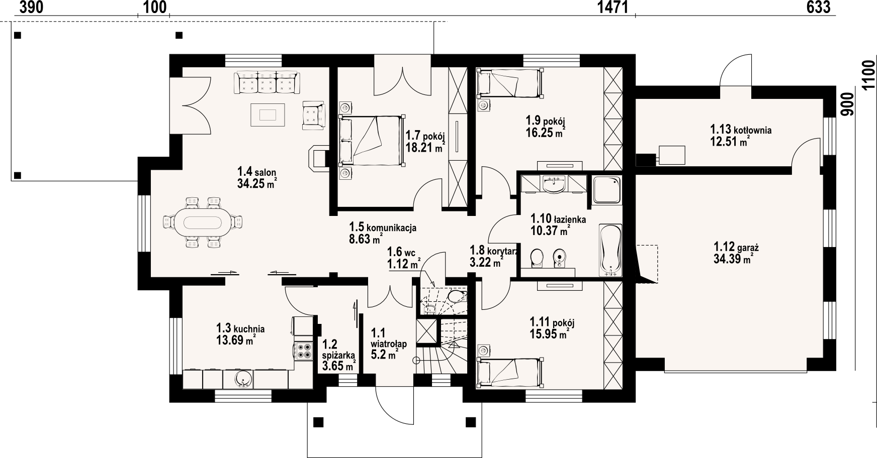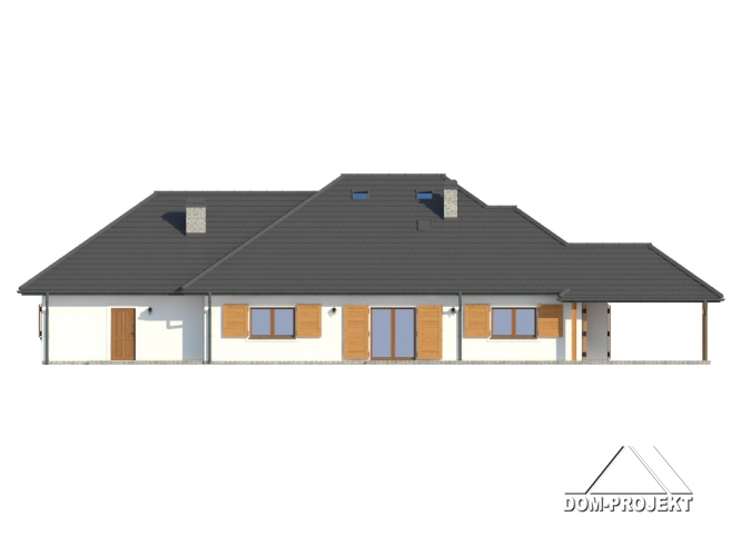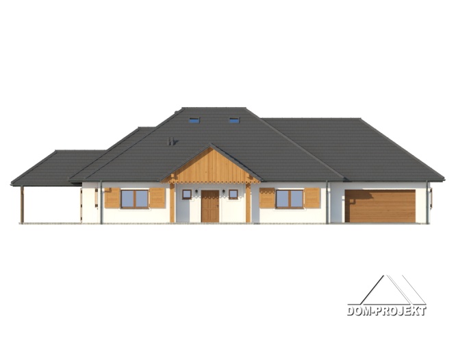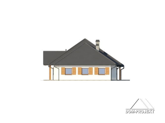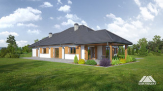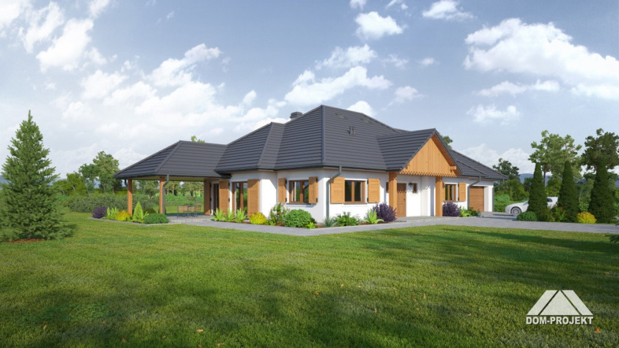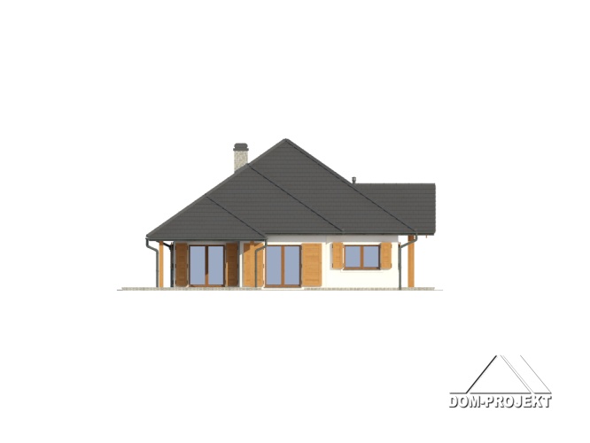 Dom parterowy z garażem na dwa samochody i kotłownią. Duży salon z kominkiem, wyjściem na zadaszony taras i szerokim przejściem do dużej i wygodnej kuchni. Obok kuchni spiżarka. Trzy wygodne pokoje, duża łazienka, komunikacja, wc, wiatrołap, garaż i kotłownia. Schody na poddasze. Na poddaszu garderoba i strych. W przyszłości poddasze można łatwo wykorzystać dla celów mieszkalnych.