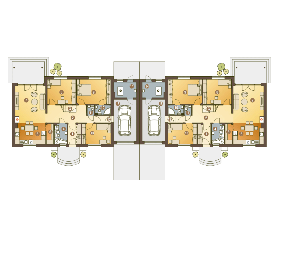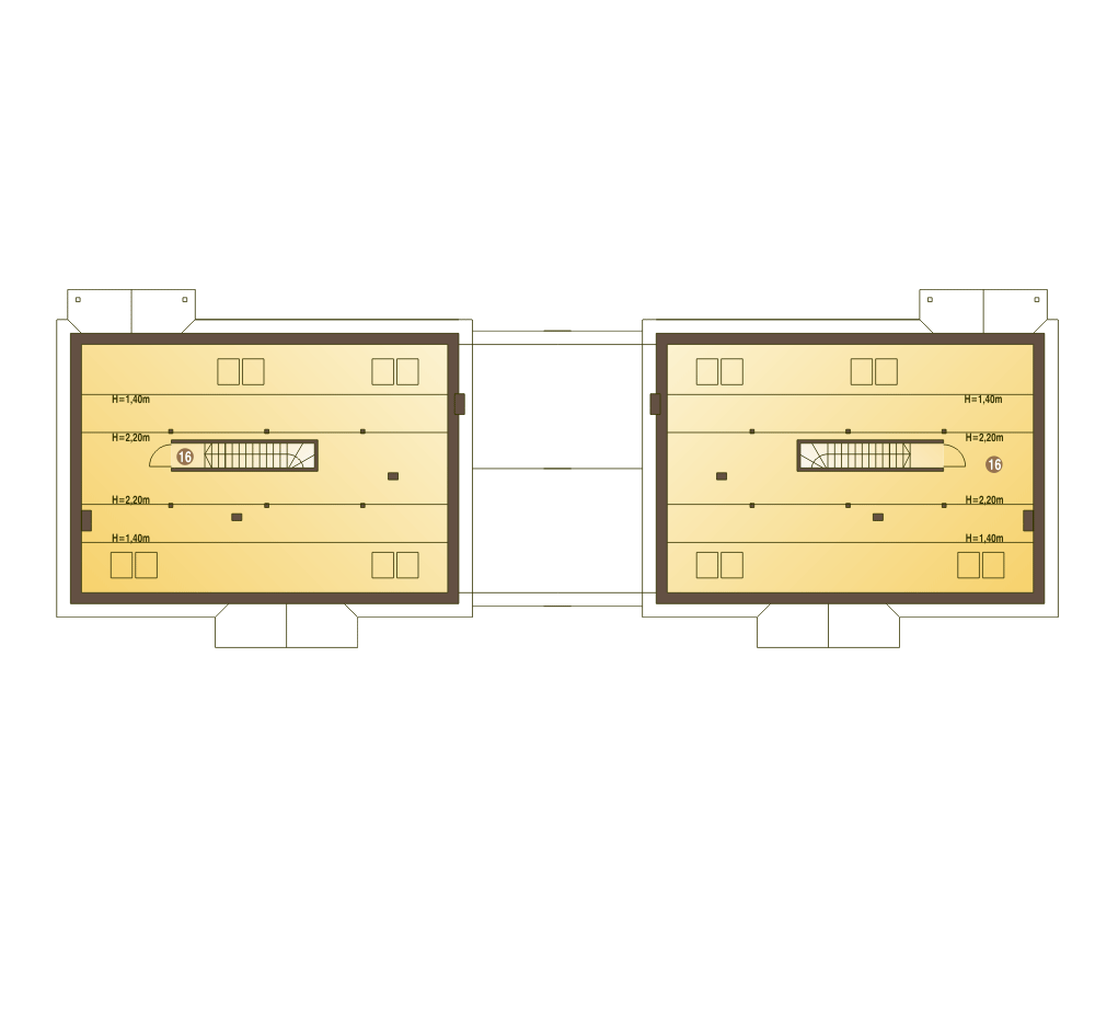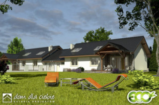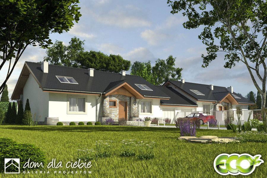 (Uwaga: projekty typu bliźniak oferujemy jako domy dwulokalowe, projekt można zamówić również w zabudowie bliźniaczej) Derkacz A-BL. Opis j dotyczy jednego segmentu: Derkacz jest optymalnym, wygodnym i tanim w budowie parterowym domem jednorodzinnym dla 4-osobowej rodziny ze strychem. Domek mieści w sobie trzy sypialnie (jedna z sypialni ma dostęp do własnej łazienki), salon, WC, łazienkę ogólną, rozplanowane wokół centralnego holu. Kuchnię ze spiżarnią zaprojektowano jako otwartą na salon. Z salonu można wyjść na zadaszony taras ogrodowy. Na poddaszu mieści się strych, do którego prowadzą regularne schody. Parametry kotłowni - pomieszczenia technicznego umożliwiają ogrzewanie dom gazem lub paliwem stałym (do wyboru). Na elewacji budynku zaproponowano materiał drewniany i kamienny.