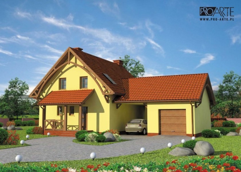Elewacja frontowa projektu Dolores od razu przyciąga uwagę innowacyjnym rozwiązaniem, ponieważ między garażem zamkniętym a domem przewidziano wiatę na drugi samochód, gdzie znajduje się także pomieszczenie gospodarcze oraz skład drewna.