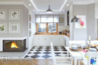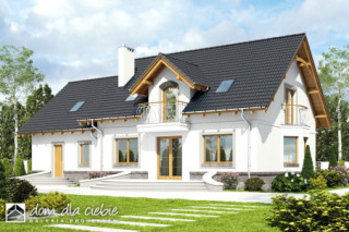 Dom Dla Ciebie 1 w wariancie z przybudowanym garażem dwustanowiskowym to projekt domu parterowego z poddaszem użytkowym z nowej serii projektów stylowych naszego autorstwa. Ten uroczy dom przeznaczony jest dla 4-6cio osobowej rodziny, zaprojektowany jest z zachowaniem podziału na dwie strefy: dzienną na parterze i nocną na poddaszu. Na parterze mamy zaprojektowany wiatrołap w którym mamy miejsce na wnękowe szafy, następnie mamy hol z którego dostaniemy się do kuchni ze spiżarnią, do salonu z jadalnią i kominkiem oraz pokoju usytuowanego od frontu, który może być wykorzystywany jako gabinet. Przy chodach mamy zaprojektowaną łazienkę z prysznicem oraz przejściową pralnię z której dostaniemy się do garażu oraz kotłowni. Poddasze obejmuje trzy ustawne i dobrze doświetlone pokoje, każdy pokój z własnym balkonem. Przy schodach zaprojektowano ogólnie dostępną łazienkę z narożną wanną i prysznicem. Nad garażem mamy do dyspozycji strych który można wykorzystać na etapie adaptacji jako dodatkowe pomieszczenie np.: pokój, garderobę lub pomieszczenie rekreacyjne. Poddasze zaprojektowane jest pod dwuspadowym dachem o tradycyjnej więźbie i ściance kolankowej. Dom Dla Ciebie 1, to projekt domu energooszczędnego, to idealna propozycją domu dla osób poszukujących tradycyjnego domu o stylowej architekturze i przemyślanej funkcji.