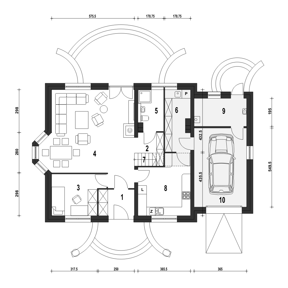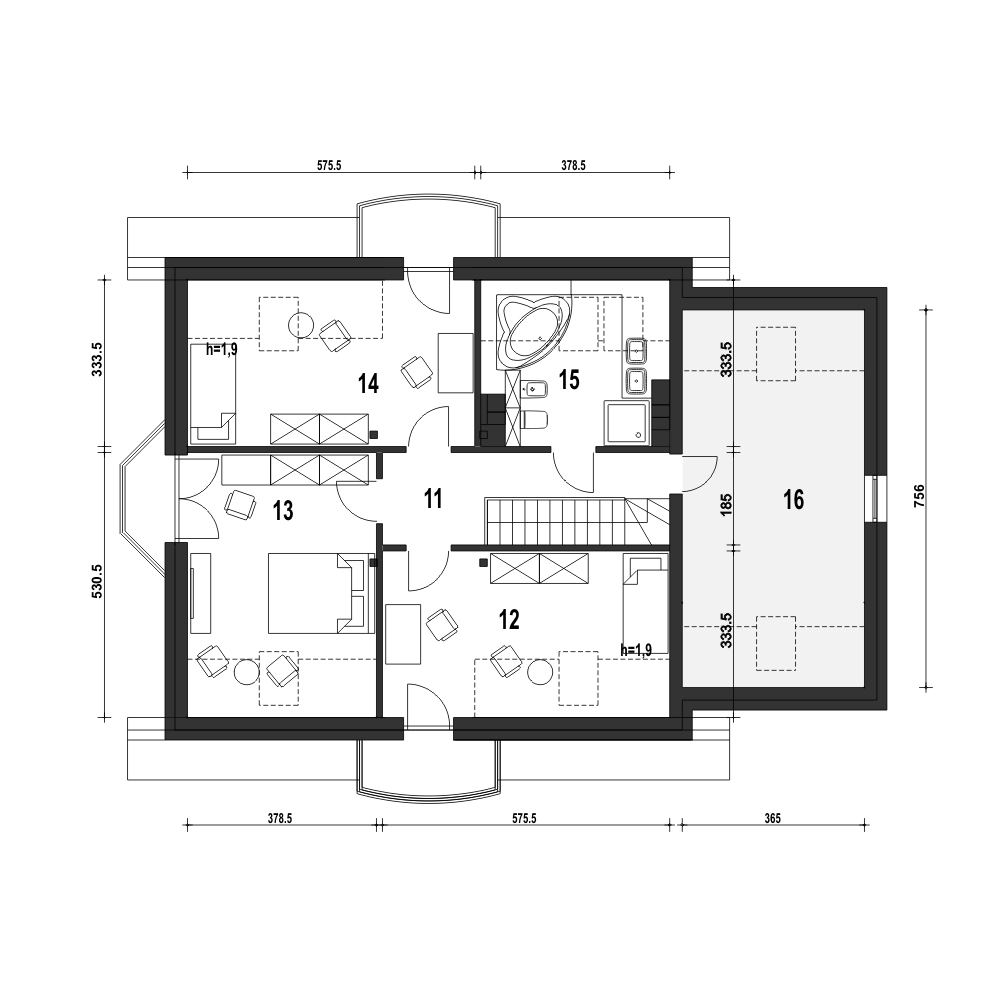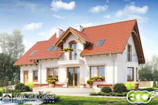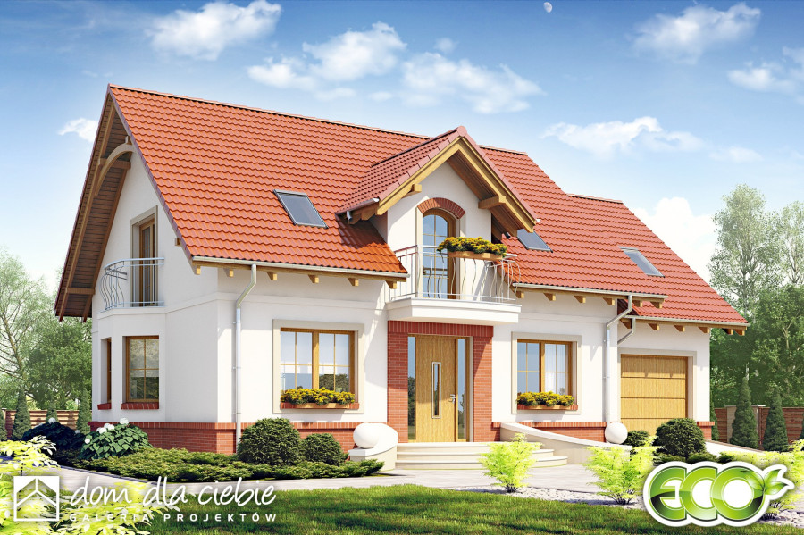 Dom Dla Ciebie 1 w2 z garażem jednospadowym przeznaczony jest dla 4ro osobowej rodziny , zaprojektowany jest z zachowaniem podziału na dwie strefy: dzienną na parterze i nocną na poddaszu. Na parterze mamy zaprojektowany wiatrołap, hol, z którego dostaniemy się do kuchni, salonu z jadalnią i kominkiem oraz pokoju usytuowanego od frontu, który może być wykorzystywany jako gabinet. Przy schodach mamy zaprojektowaną łazienkę z prysznicem oraz przejściową spiżarnię, z której dostaniemy się do garażu oraz kotłowni. Poddasze obejmuje trzy ustawne i dobrze doświetlone pokoje, każdy pokój z własnym balkonem. Przy schodach zaprojektowano ogólnie dostępną łazienkę z narożną wanną i prysznicem. Nad garażem mamy do dyspozycji strych, który można wykorzystać na etapie adaptacji jako dodatkowe pomieszczenie np.: pokój, garderobę lub pomieszczenie rekreacyjne. Poddasze zaprojektowane jest pod dwuspadowym dachem opartym na tradycyjnej więźbie i ściance kolankowej. Projekt Dom Dla Ciebie 1 w2, to idealna propozycją domu dla osób poszukujących tradycyjnego domu o stylowej architekturze i przemyślanej funkcji.fundamenty: BETONOWE ściany zewnętrzne: POROTHERM+STYROPIAN TERMO ORGANIKA rodzaj stropu: TERIVA I elewacje: TYNK STRUKTURALNY, OKŁADZINA KLINKIEROWA pokrycie dachu: DACHÓWKA CEMENTOWA, CERAMICZNA lub BLACHA DACHÓWKO PODOBNA