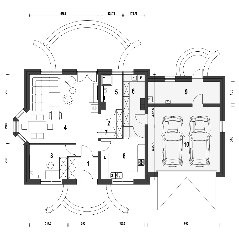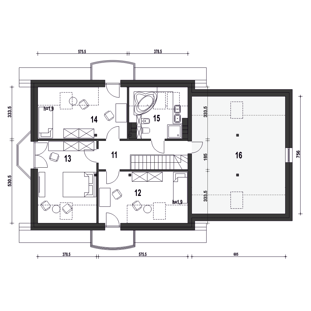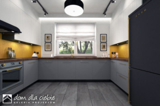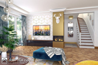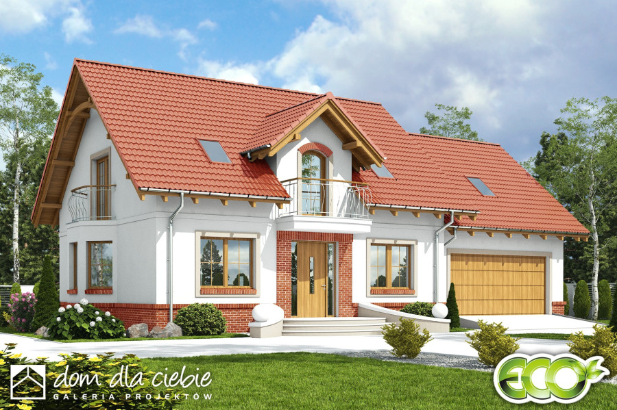 Dom Dla Ciebie 1 w2 z dwustanowiskowym garażem, przeznaczony jest dla 4-6cio osobowej rodziny , zaprojektowany jest z zachowaniem podziału na dwie strefy: dzienną na parterze i nocną na poddaszu. Na parterze mamy zaprojektowany wiatrołap, hol, z którego dostaniemy się do kuchni, salonu z jadalnią i kominkiem oraz pokoju usytuowanego od frontu, który może być wykorzystywany jako gabinet. Przy schodach mamy zaprojektowaną łazienkę z prysznicem oraz przejściową spiżarnię, z której dostaniemy się do garażu oraz kotłowni. Poddasze obejmuje trzy ustawne i dobrze doświetlone pokoje, każdy pokój z własnym balkonem. Przy schodach zaprojektowano ogólnie dostępną łazienkę z narożną wanną i prysznicem. Nad garażem mamy do dyspozycji strych, który można wykorzystać na etapie adaptacji jako dodatkowe pomieszczenie np.: pokój, garderobę lub pomieszczenie rekreacyjne. Poddasze zaprojektowane jest pod dwuspadowym dachem opartym na tradycyjnej więźbie i ściance kolankowej o wysokości pona 0,9m. Projekt Dom Dla Ciebie 1 w2, to projekt energooszczędny, to idealna propozycją domu dla osób poszukujących tradycyjnego domu o stylowej architekturze i przemyślanej funkcji.