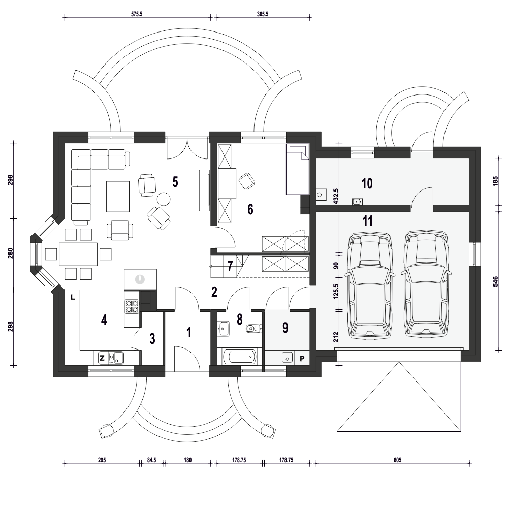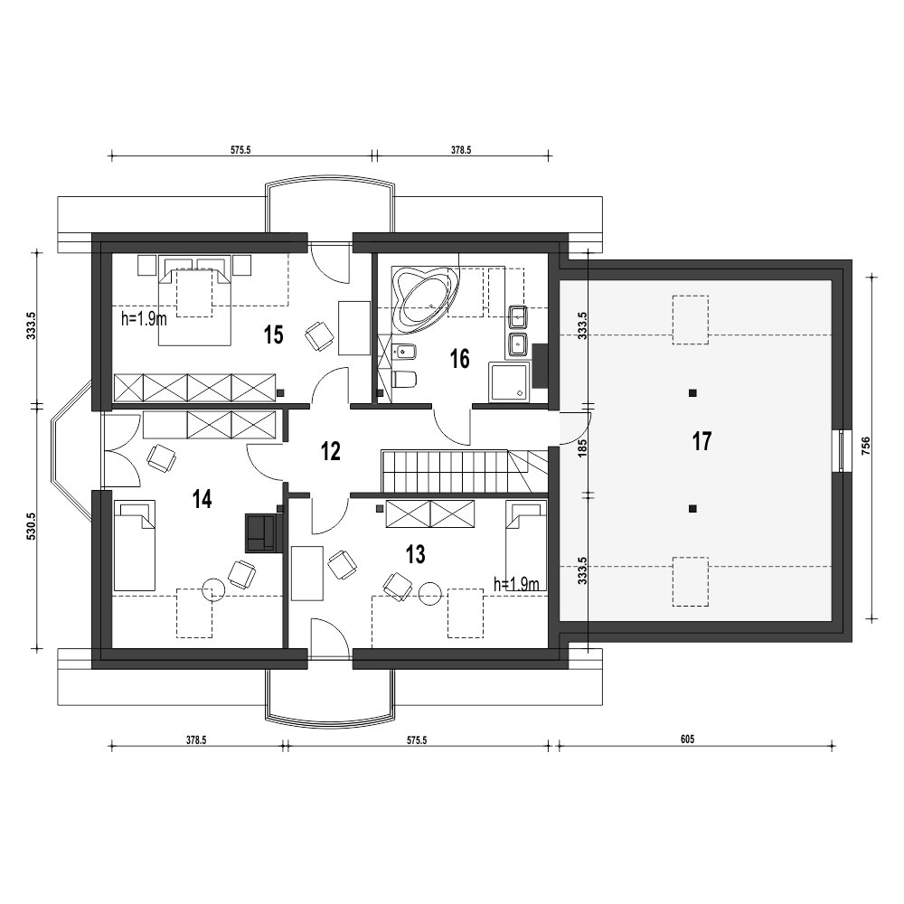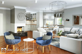 Dom Dla Ciebie 1 w3 z garażem dwustanowiskowym przeznaczony jest dla 4-5cio osobowej rodziny. Zaprojektowany jest z zachowaniem podziału na dwie strefy: dzienną na parterze i nocną na poddaszu. Na parterze mamy zaprojektowany wiatrołap, hol, kuchnię, salon z jadalnią i kominkiem oraz pokój usytuowanego od strony ogrodowej. Przy schodach mamy zaprojektowaną łazienkę z wanną oraz osobna pralnię. Obok mamy wejście do dwustanowiskowego garażu oraz kotłowni. Poddasze obejmuje trzy ustawne i dobrze doświetlone pokoje, każdy pokój z własnym balkonem. Na poddaszu zaprojektowano ogólnie dostępną łazienkę z narożną wanną i prysznicem. Nad garażem mamy do dyspozycji strych, który można wykorzystać na etapie adaptacji jako dodatkowe pomieszczenie (pokój, garderobę lub pomieszczenie rekreacyjne). Poddasze zaprojektowane jest pod dwuspadowym dachem o układzie kalenicowym, opartym na tradycyjnej więźbie dachowej i ściance kolankowej wys 0,9m. Projekt Dom Dla Ciebie 1 w3, to idealna propozycja domu dla osób poszukujących domu energooszczędnego, o stylowej architekturze i przemyślanej funkcji.