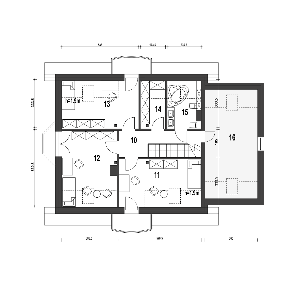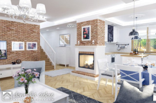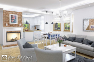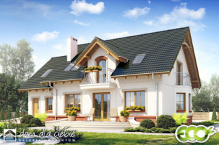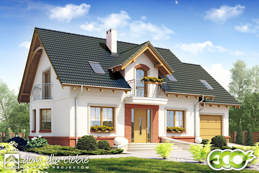 Dom Dla Ciebie 1 w 4 bez garażu przeznaczony jest dla 4 ro osobowej rodziny , zaprojektowany jest z zachowaniem podziału na dwie strefy: dzienną na parterze i nocną na poddaszu. Na parterze mamy zaprojektowany wiatrołap, hol, kuchnię, salon z jadalnią i kominkiem oraz pokój usytuowanego od strony ogrodowej. Od frontu zaprojektowano łazienkę z wanną. Poddasze obejmuje trzy ustawne i dobrze doświetlone pokoje, każdy pokój z własnym balkonem. Na poddaszu zaprojektowano ogólnie dostępną łazienkę z narożną wanną i prysznicem. Poddasze zaprojektowane jest pod dwuspadowym dachem opartym na tradycyjnej więźbie i ściance kolankowej. Projekt Dom Dla Ciebie 1 w4, to idealna propozycją domu dla osób poszukujących tradycyjnego domu o stylowej architekturze i przemyślanej funkcji.fundamenty: BETONOWE ściany zewnętrzne: POROTHERM+STYROPIAN TERMO ORGANIKA rodzaj stropu: TERIVA I elewacje: TYNK STRUKTURALNY, OKŁADZINA KLINKIEROWA pokrycie dachu: DACHÓWKA CEMENTOWA, CERAMICZNA lub BLACHA DACHÓWKO PODOBNA