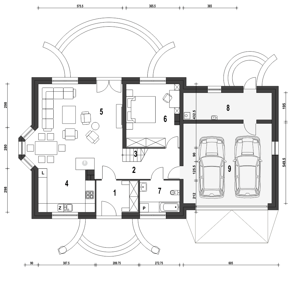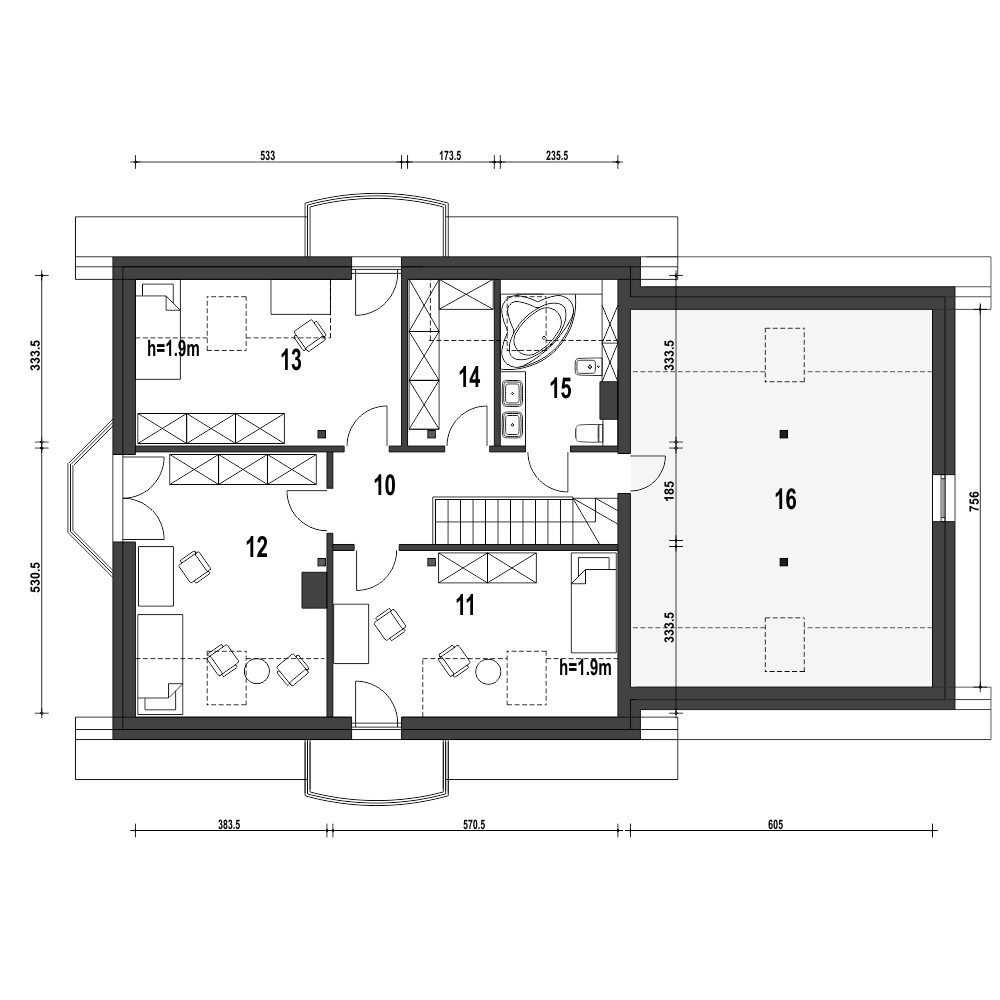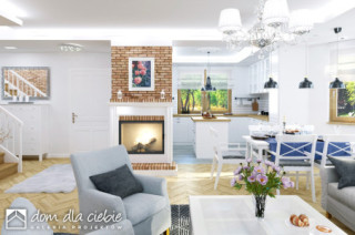 Dom Dla Ciebie 1 w 4 z garażem dwustanowiskowym przeznaczony jest dla 4-6cio ro osobowej rodziny, zaprojektowany jest z zachowaniem podziału na dwie strefy: dzienną na parterze i nocną na poddaszu. Na parterze mamy zaprojektowany wiatrołap, hol, kuchnię, salon z jadalnią i kominkiem oraz pokój usytuowanego od strony ogrodowej, a od frontu zaprojektowano łazienkę z wanną. Poddasze obejmuje trzy ustawne i dobrze doświetlone pokoje, każdy pokój z własnym balkonem. Na poddaszu zaprojektowano ogólnie dostępną łazienkę z narożną wanną i prysznicem. Poddasze zaprojektowane jest pod dwuspadowym dachem na tradycyjnej więźbie i ściance kolankowej. Projekt Dom Dla Ciebie 1 w4, to idealna propozycją domu dla osób poszukujących tradycyjnego domu o stylowej architekturze i przemyślanej funkcji. To dom energooszczędny, ekonomiczny w budowie i w użytkowaniu.