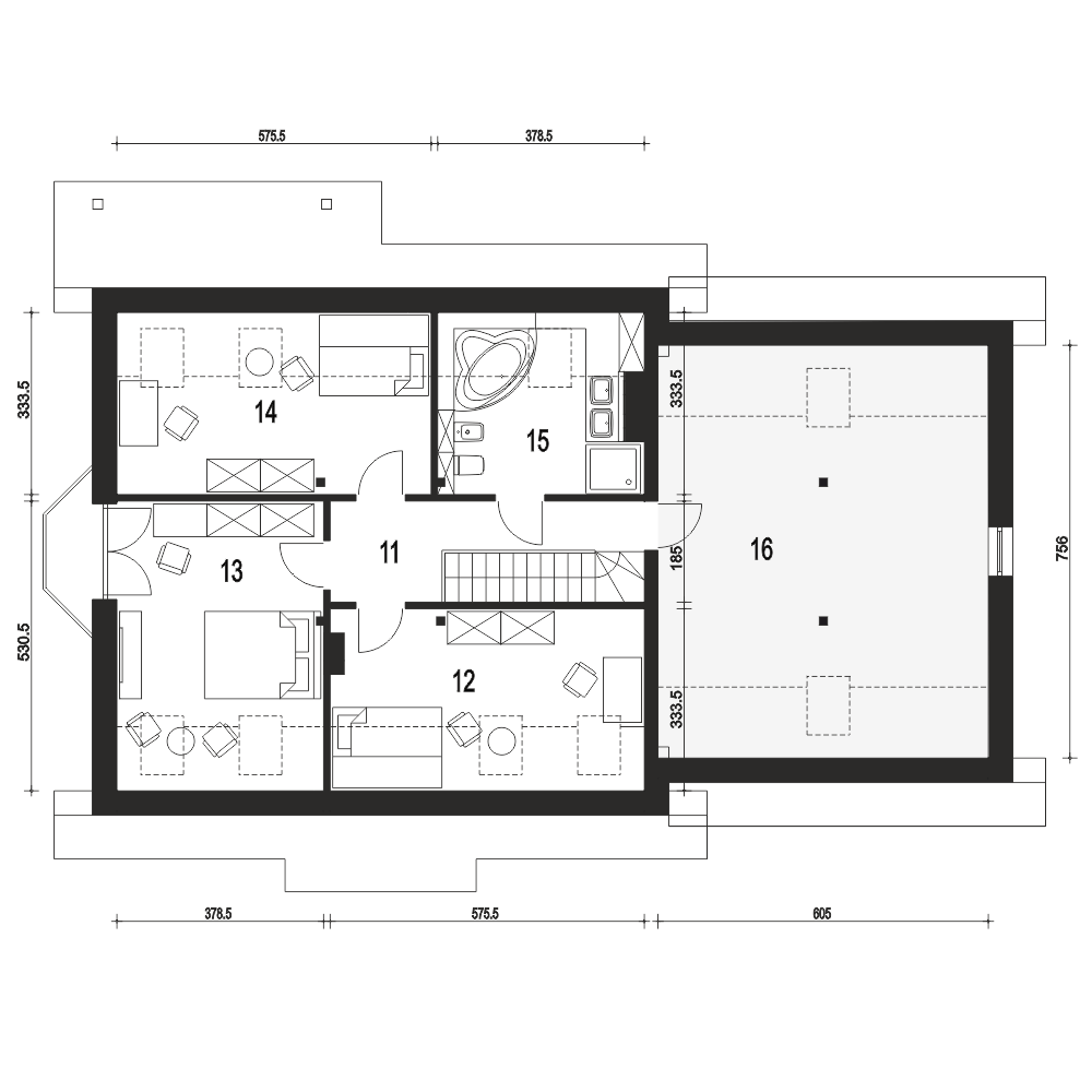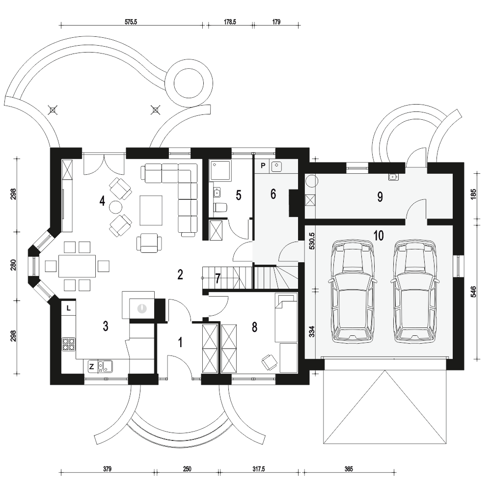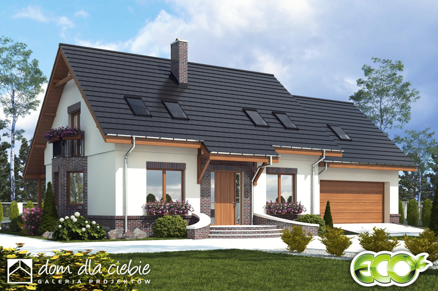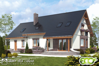 Dom Dla Ciebie 2 w wariancie z przybudowanym garażem dwustanowiskowym, to projekt domu dwukondygnacyjnego - z poddaszem użytkowym. Ten atrakcyjny dom zaprojektowany jest dla 4ro osobowej rodziny z zachowaniem podziału na dwie strefy: dzienną na parterze i nocną na poddaszu. Na parterze tego domu zaprojektowany mamy wiatrołap w z miejscem na wnękowe szafy, następnie hol z którego dostaniemy się do kuchni ze spiżarnią, do salonu z jadalnią i kominkiem oraz do pokoju usytuowanego od frontu budynku - pokój ten może być wykorzystywany jako gabinet, np na etapie adaptacji. Przy schodach mamy przewidzianą niewielką ale wygodną łazienkę z prysznicem, a także przejściową pralnię, z której dostaniemy się do garażu oraz kotłowni. Poddasze tego domu obejmuje trzy ustawne i wygodne pokoje, a przy schodach zaprojektowano ogólnie dostępną łazienkę z narożną wanną i prysznicem. Nad garażem mamy do dyspozycji strych który można wykorzystać, np.: na etapie adaptacji jako dodatkowe pomieszczenie: pokój, garderobę lub pomieszczenie rekreacyjne. Poddasze zaprojektowane jest pod dwuspadowym dachem na tradycyjnej więźbie ze śianką kolankową. Projekt Dom Dla Ciebie 2, to idealna propozycją domu dla osób poszukujących ekonomicznego w budowie i energooszczędnego domu o stylowej, współczesnej architekturze i przemyślanej funkcji.
