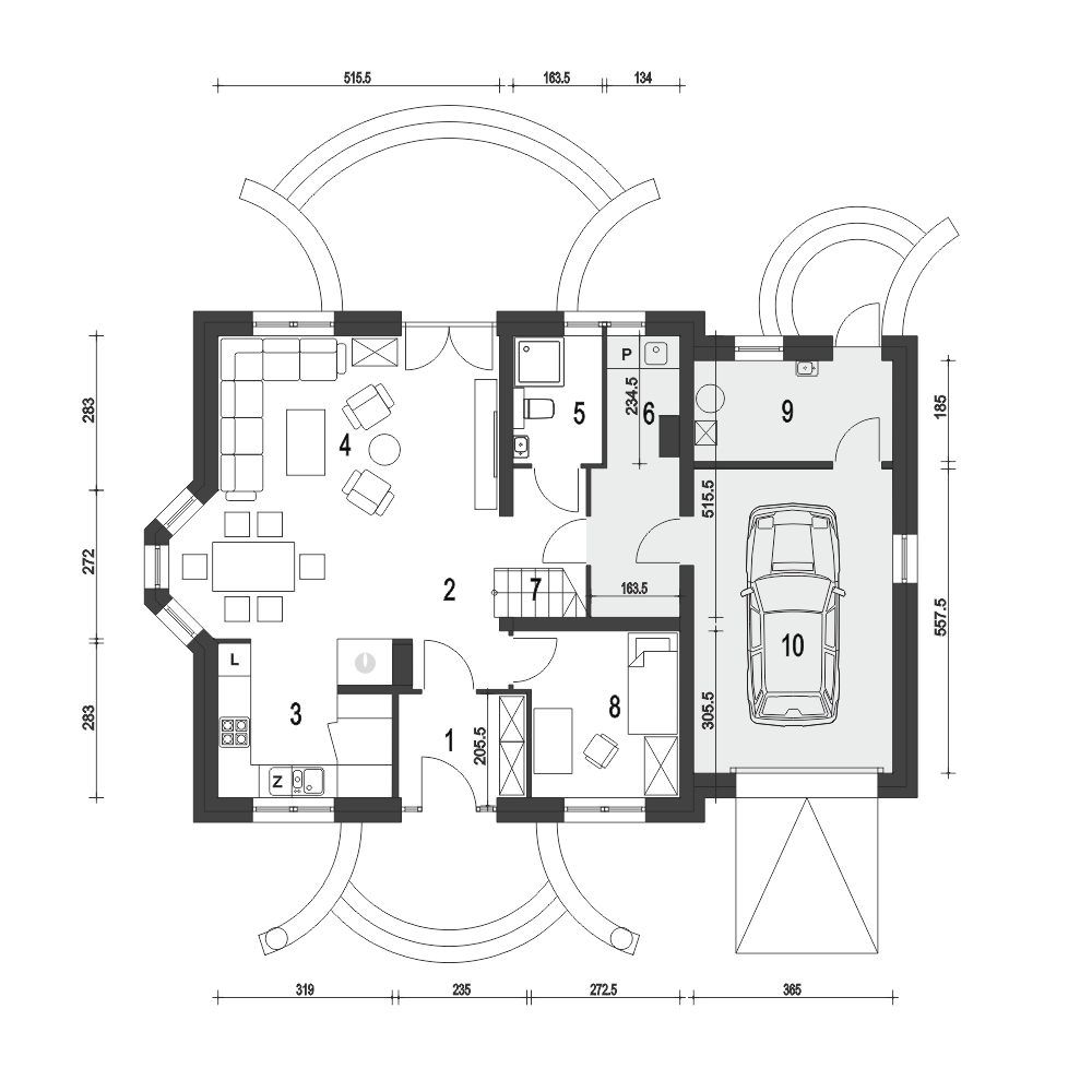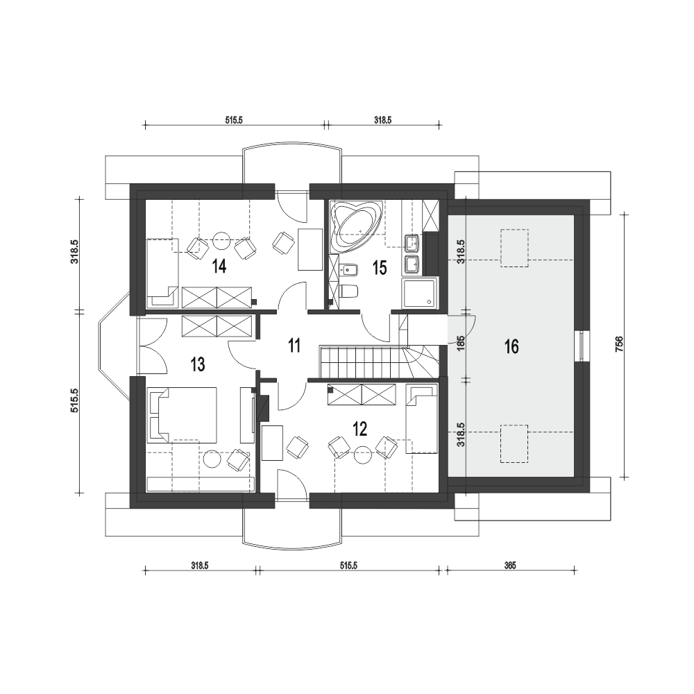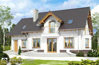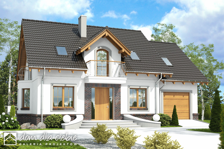 Dom Dla Ciebie 5 z garażem jednostanowiskowym to mniejsza wersja popularnego projektu Dom Dla Ciebie 1. Dom Dla Ciebie 5 to projekt domu o popularnej powierzchni użytkowej około 110 m2. To projekt z użytkowym poddaszem, o tradycyjnej więźbie drewnianej ze ścianką kolankową o wysokości około 1m. Przeznaczony jest dla 4ro osobowej rodziny i tak jak pozostałe projekty z tej serii zaprojektowany został z zachowaniem podziału na dwie strefy: ogólnie dostępną i prywatną. Strefa ogólnie dostępna przewidziana jest na parterze. Mamy tu wiatrołap z wnękowymi szafami, hol, kuchnię ze spiżarnią, salon z jadalnią i kominkiem oraz pokój od frontu, który może służyć jako gabinet. Ponadto jest tu nieduża łazienka z prysznicem oraz przechodnia pralnia z której dostaniemy się do garażu. Za Garażem, od strony ogrodu zaprojektowana jest kotłownia, która dodatkowo może spełnić funkcję pomieszczenia gospodarczego. Na poddasze prowadzą jednobiegowe schody, którymi ostaniemy się do przedpokoju prowadzącego do 3 wygodnych i dobrze oświetlonych pokoi z balkonami. Bezpośrednio ze schodów mozemy się dostać do nieużytkowego strychu, który z łatwością możemy zaadaptować na cele mieszkaniowe. Na poddaszu jest też przewidziana ogólnie dostępną łazienka z narożną wanną i prysznicem. Projekt domu Dom Dla Ciebie 5, to propozycja dla szukających projektu domu tradycyjnego o stylowej architekturze, funkcjonalnym wnętrzu i o energooszczędnych parametrach.fundamenty: BETONOWE ściany zewnętrzne: POROTHERMm+STYROPIAN TERMO ORGANIKA rodzaj stropu: TERIVA I elewacje: TYNK STRUKTURALNY, OKŁADZINA KLINKIEROWA pokrycie dachu: DACHÓWKA CEMENTOWA, CERAMICZNA lub BLACHA DACHÓWKO PODOBNA
