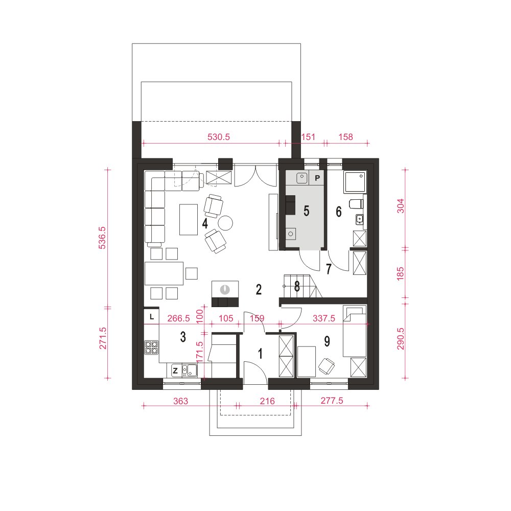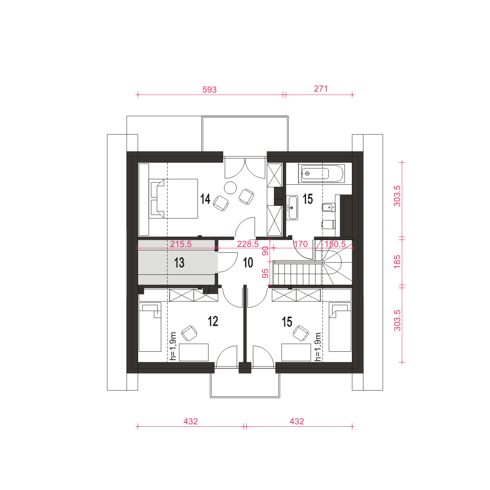 Dom Dla Ciebie 6 to projekt domu z użytkowym poddaszem dla 4-5cio osobowej rodziny. To propozycja domu o często wyszukiwanej powierzchni użytkowej około 110 m2. Tak jak pozostałe projekty z tej serii, Dom Dla Ciebie 6 zaprojektowany został z zachowaniem podziału na dwie strefy użytkowe ogólnie dostępną na parterze i prywatną na poddaszu. Na parterze mamy zaprojektowany wiatrołap z szafą wnękową, hol, kuchnię ze spiżarnią, salon z jadalnią i kominkiem oraz pokój zlokalizowany od frontu domu, do wykorzystania jako gabinet. Przy schodach prowadzących na poddasze, zlokalizowano kotłownię z pralnią i wygodna łazienkę. Na poddaszu mamy zaprojektowane trzy ustawne i dobrze doświetlone pokoje - każdy z własnym balkonem. Zaprojektowano tu też niewielki strych z możliwością wykorzystania go na garderobę oraz ogólnie dostępną łazienka z pełnym wyposażeniem. Poddasze zaprojektowane jest pod dwuspadowym dachem zaprojektowanym na tradycyjnej więźbie dachowej opartej na ściance kolankowej o wysokości około 1m. Projekt domu Dom Dla Ciebie 6, jest idealna propozycja domu energooszczędnego, taniego w budowie i w użytkowaniu. Ogromna zaletą projektu jest prosta konstrukcja domu i dobrze zaprojektowana funkcja.fundamenty: BETONOWE ściany zewnętrzne: POROTHERM+STYROPIAN TERMO ORGANIKA rodzaj stropu: TERIVA I elewacje: TYNK STRUKTURALNY, OKŁADZINA KLINKIEROWA pokrycie dachu: DACHÓWKA CEMENTOWA, CERAMICZNA lub BLACHA DACHÓWKO PODOBNA