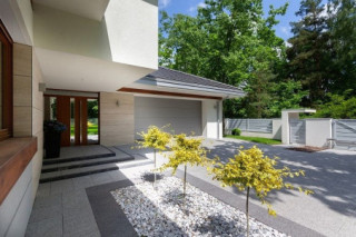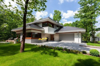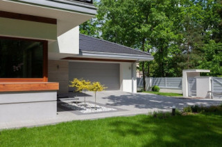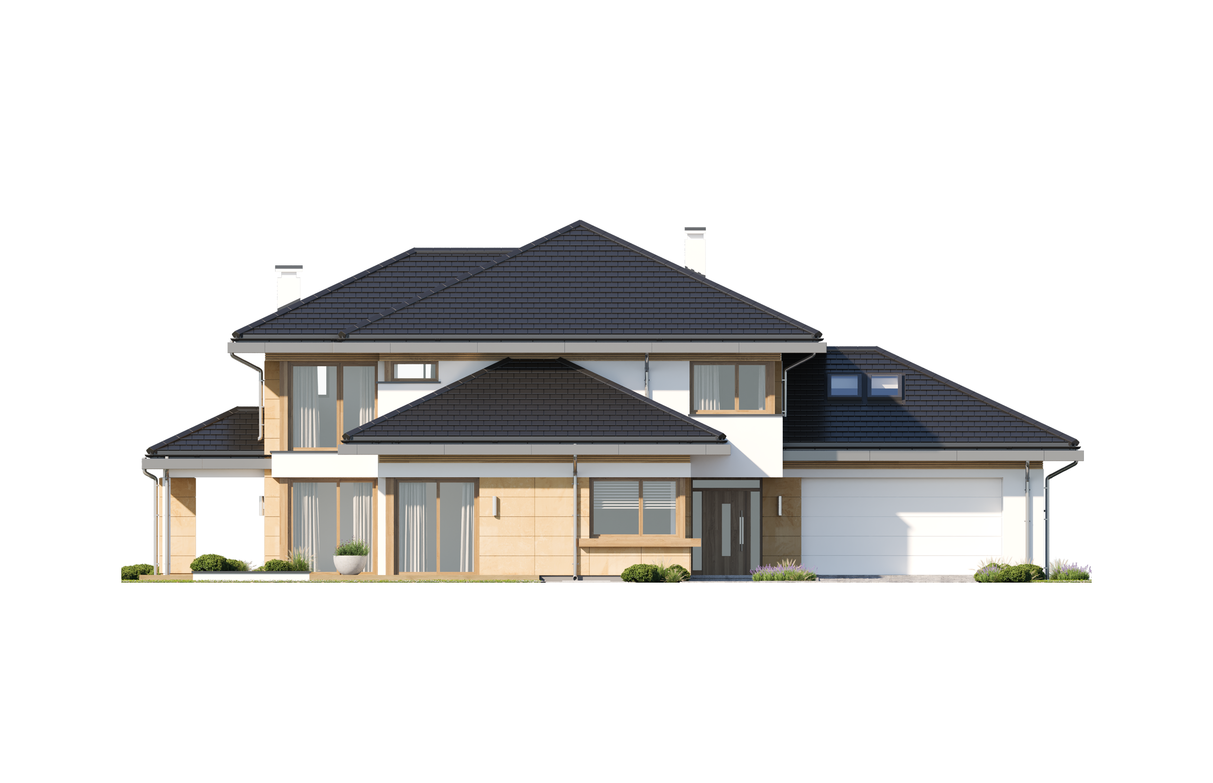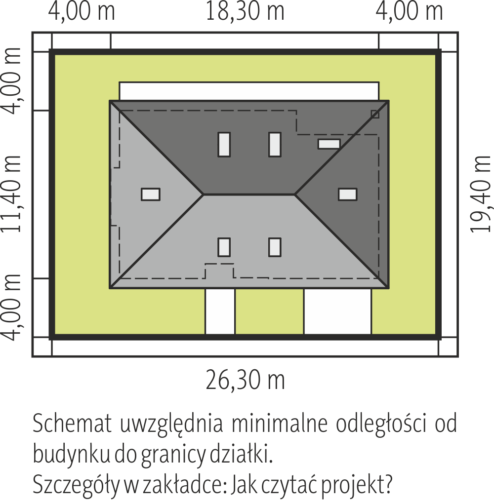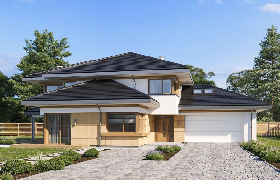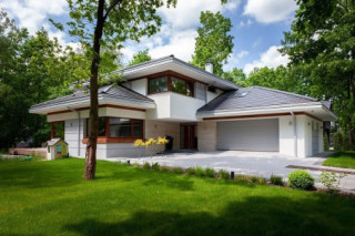 Dom na miarę 2 jest nieco powiększoną wersją wariantową projektu Dom na miarę. Jest to parterowy dom jednorodzinny dla 4-5cioosobowej rodziny - wersja z dwustanowiskowym garażem. Budynek zbudowany jest na rzucie wydłużonego wgłęb działki prostokąta, z dobudowanymi poprzecznymi bryłami salonu z podcieniem i garażu. Dom przykrywa wielospadowy dach o kącie nachylenia 30 stopni. Nad wnętrzem parteru kryje się spory strych, możliwy do zaadaptowania na poddasze. Dom doskonale nadaje się na wąską działkę w wjazdem od południa. Dzięki umieszczeniu większości okien części dziennej na bocznej i frontowej elewacji wnętrze jest idealnie oświetlone, a boczny i wysunięty na front ogródek będzie prawidłowo nasłoneczniony. Dom ma nowoczesny wygład. Główna bryła i detale tworzą ciekawą, a zarazem spoko