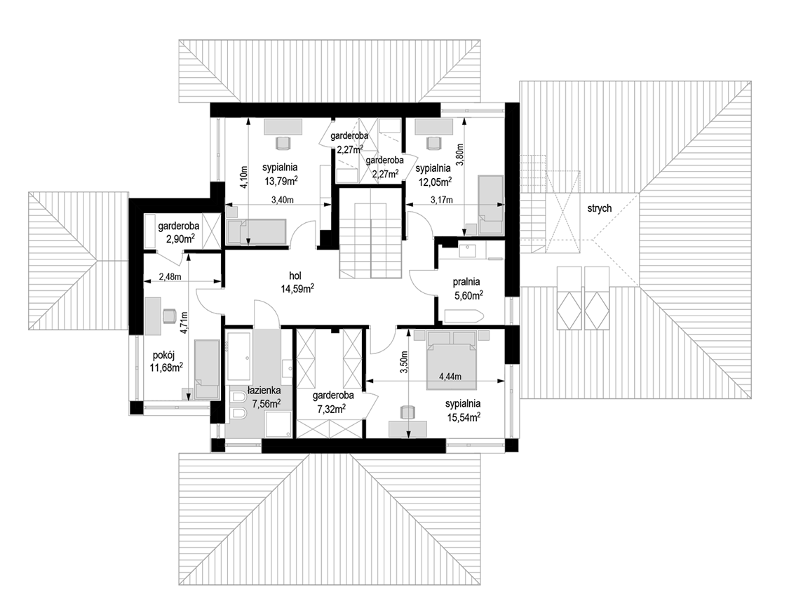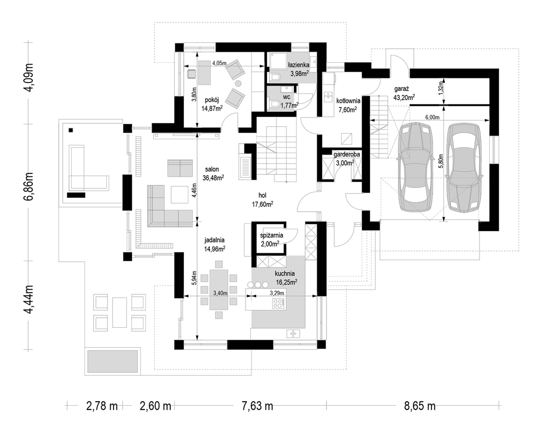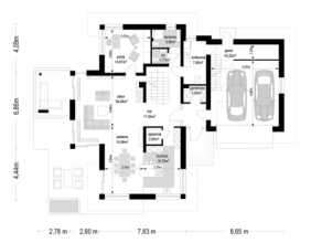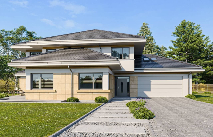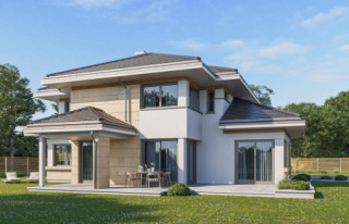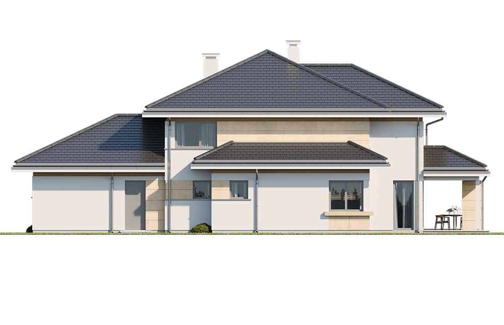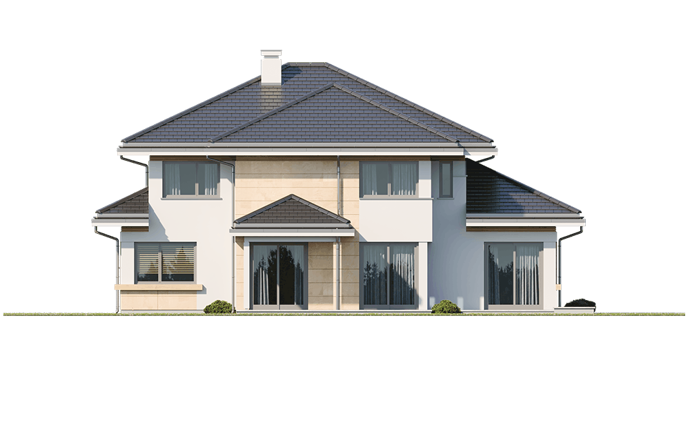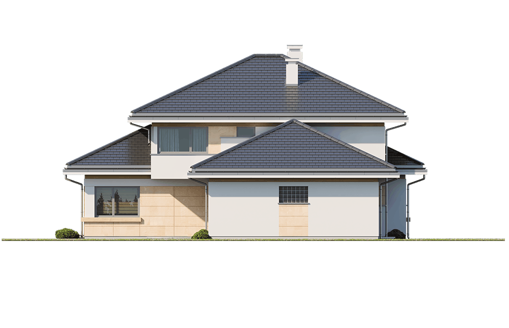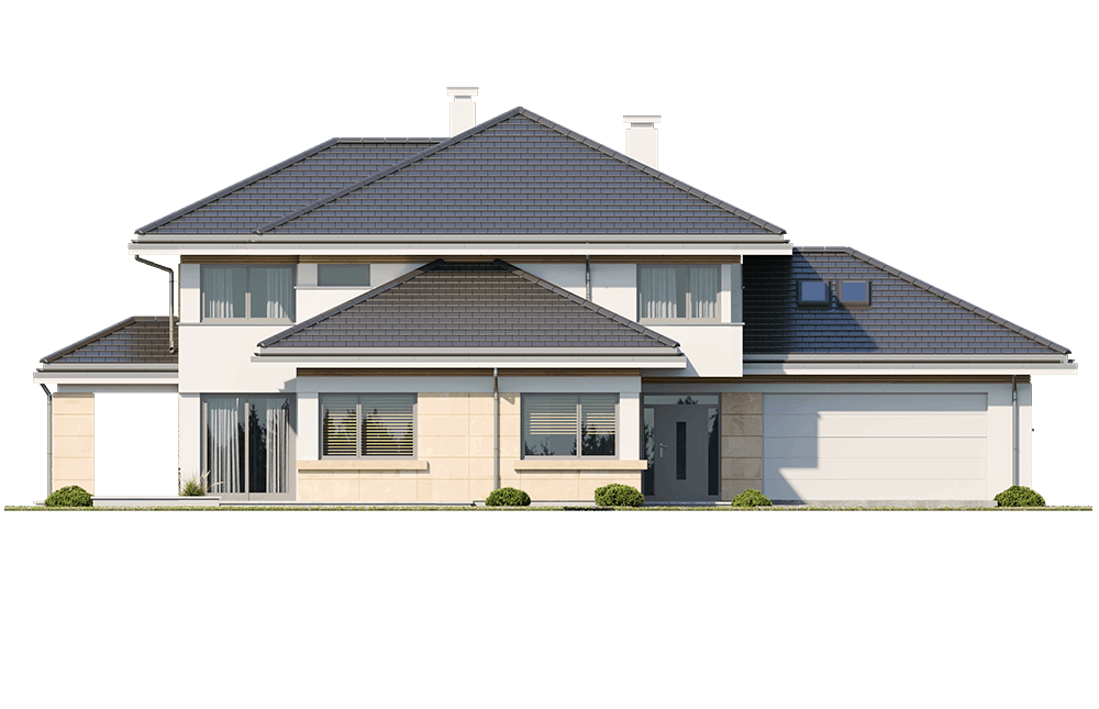 Dom na parkowej 6 to kolejny projekt z kolekcji Domów na Parkowej - tym razem większą wersję tego projektu. Dom jednorodzinny dla 3-6cioosobowej rodziny, parterowy, ze strychem, który można zaadaptować łatwo i wykorzystać na poddasze użytkowe. Budynek ma prostokątną bryłę, przykrytą czeto spadowym dachem. Od strony elewacji frontowej dobudowany jest do niej garaż dwustanowiskowy. Reprezentacyjny front domu, przywołujący na myśl amerykańskie rezydencje z bogatych przedmieści, ozdobiony jest pięknym, wspartym na kolumnach zadaszeniem nad drzwiami wejściowymi. Jest to centralny element elewacji frontowej skupiający całą uwagę. Podobnie od strony ogrodu: głównym elementem ozdabiającym elewację jest piękne zadaszenie nad tarasem, oraz duże przeszklenia salonu. Architektura domu nasycona klasy