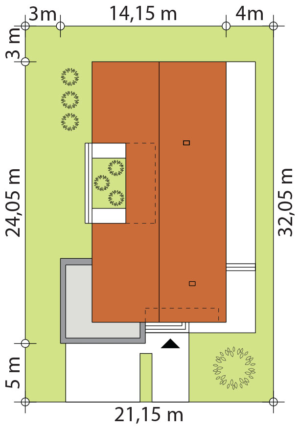 Gotowy projekt domu parterowego, z garażem jednostanowiskowym. Wykonany w technologii tradycyjnej murowanej, z więźbą o konstrukcji drewnianej. W skład programu użytkowego wchodzą cztery pokoje i jedna łazienka. Przeznaczony na wąską działkę.