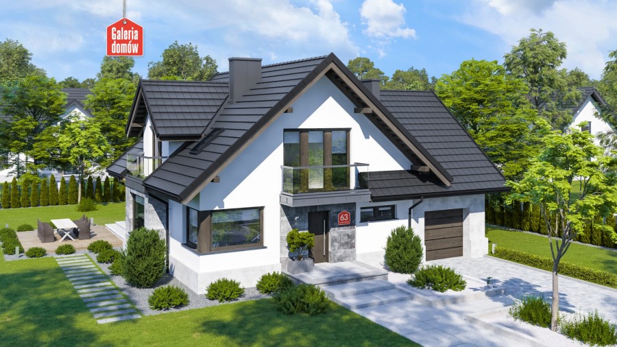 Dom przy Cyprysowej 63 to budynek jednorodzinny, z poddaszem użytkowym, o powierzchni 145.72 m². Posiada dach dwuspadowy z lukarną od frontu i kalenicą równoległą do drogi. Nowoczesny dom został zaprojektowany w wersji energooszczędnej, dostosowanej do standardów WT 2021. Wnętrze mieści otwartą strefę dzienną, na którą składają się; salon z jadalnią i kuchnia. W bryle budynku przewidziano pojedynczy garaż, za którym ulokowano kotłownię. Na parterze ponadto funkcjonuje dodatkowy pokój, łazienka oraz pralnia. Poddasze wykorzystano na część nocną, którą tworzą 4 sypialnie oraz duży kąpielowy pokój. W sypialni małżeńskiej zaprojektowano prywatną łazienkę. Dom przy Cyprysowej 63 posiada prostą konstrukcję, dlatego jest tani w budowie i ekonomiczny w użytkowaniu. Nowoczesne wykończenie elewacji oparto o szklane balkony, stolarkę w kolorze drewna i czarno-białą kolorystykę. Doskonała propozycja dla 4-5 osobowej rodziny