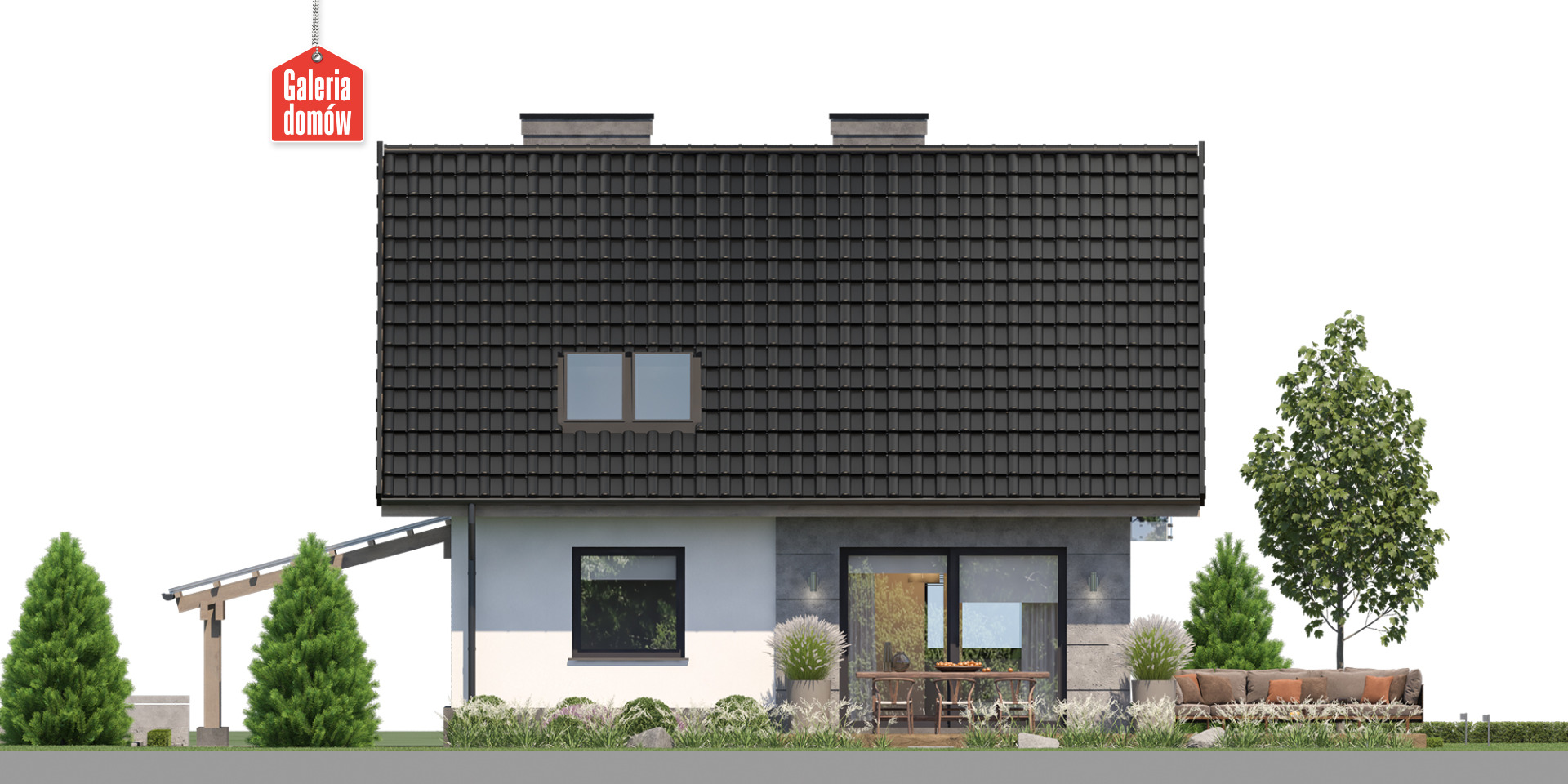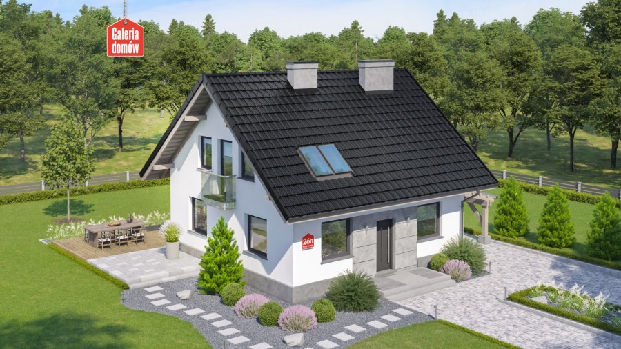 Nowoczesny dom o prostej bryle i ergonomicznym układzie funkcjonalnym. Kolorystyka elewacji, stylowe detale i wysoki standard wykończeń nadają mu charakter i poprawiają wygodę użytkowania. Duże przeszklenia przesuwnych drzwi tarasowych naturalnie rozświetlają wnętrze pokoju dziennego i sypialni. Estetyczną wartość budynku wzbogaca szklany balkonik od strony ogrodu oraz oryginalne oświetlenia fasady. Wnętrze domu jest przejrzyste i doskonale skomunikowane. Dużą zaletą jest przestronny salon z wyjściem na taras, lub do ogrodu. Ciszę i spokój zapewnia poddasze z trzema przytulnymi sypialniami. To idealne rozwiązanie dla osób ceniących modny design oraz solidne, sprawdzone rozwiązania w nowoczesnej odsłonie.