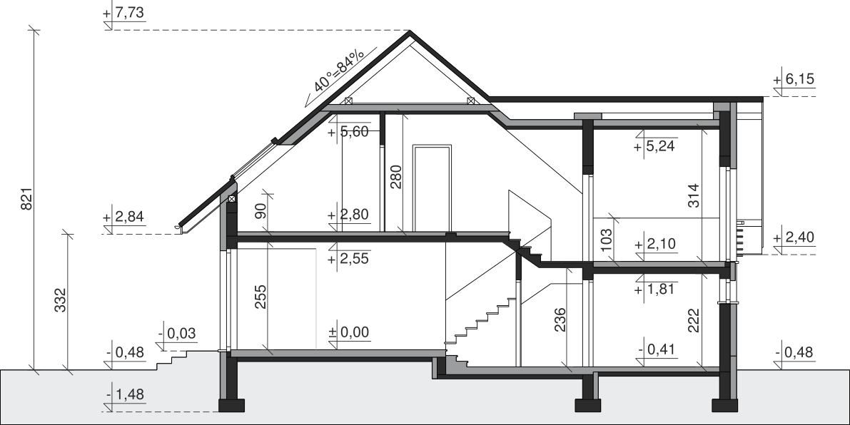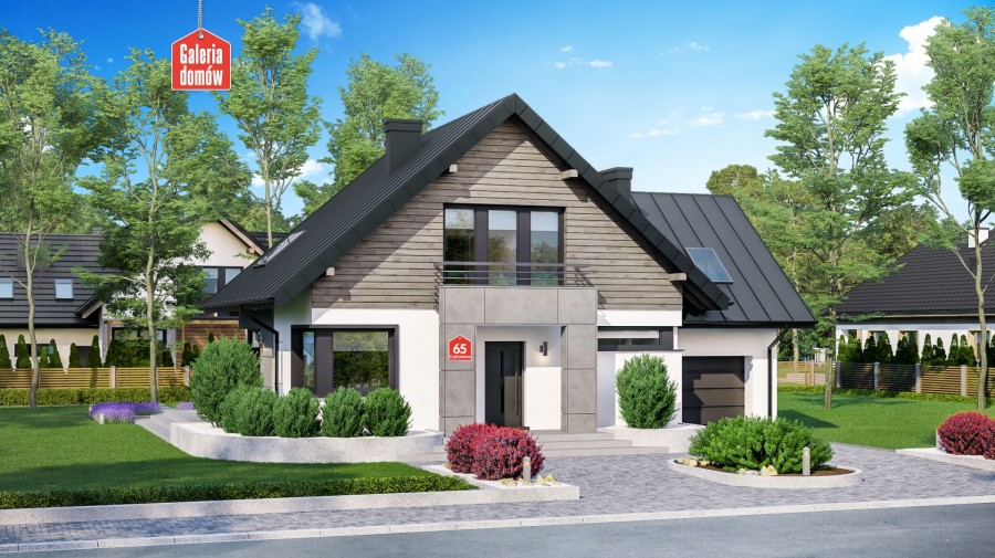 Gotowy projekt Dom przy Cyprysowej 65 to budynek jednorodzinny, z poddaszem użytkowym, o powierzchni 113.46 m². Posiada dach dwuspadowy z kalenicą prostopadłą do drogi. Nowoczesny dom został zaprojektowany w wersji energooszczędnej, dostosowanej do standardów WT 2021. Układ funkcjonalny to strefa dzienna, na którą składają się; salon z jadalnią i kuchnia wraz ze spiżarnią. W bryle budynku przewidziano pojedynczy garaż, za którym znajduje się kotłownia. Na parterze ponadto zaprojektowano dodatkowy pokój, łazienkę oraz pralnię. Poddasze wykorzystano na część nocną, którą tworzą 4 sypialnie oraz duża łazienka. Dom przy Cyprysowej 65 posiada prostą konstrukcję, dlatego jest stosunkowo tani w budowie i ekonomiczny w użytkowaniu. Nowoczesne wykończenie elewacji zakłada wykorzystanie drewna, betonu dekoracyjnego i stali. Cyprysowa 65 to doskonała propozycja dla 4-5 osobowej rodziny ceniącej zalety domu z poddaszem.