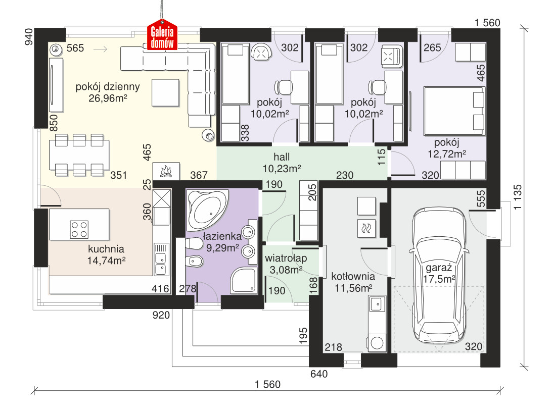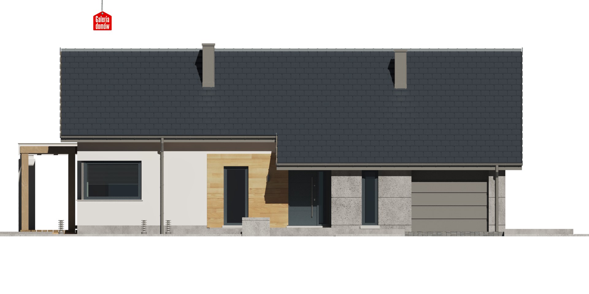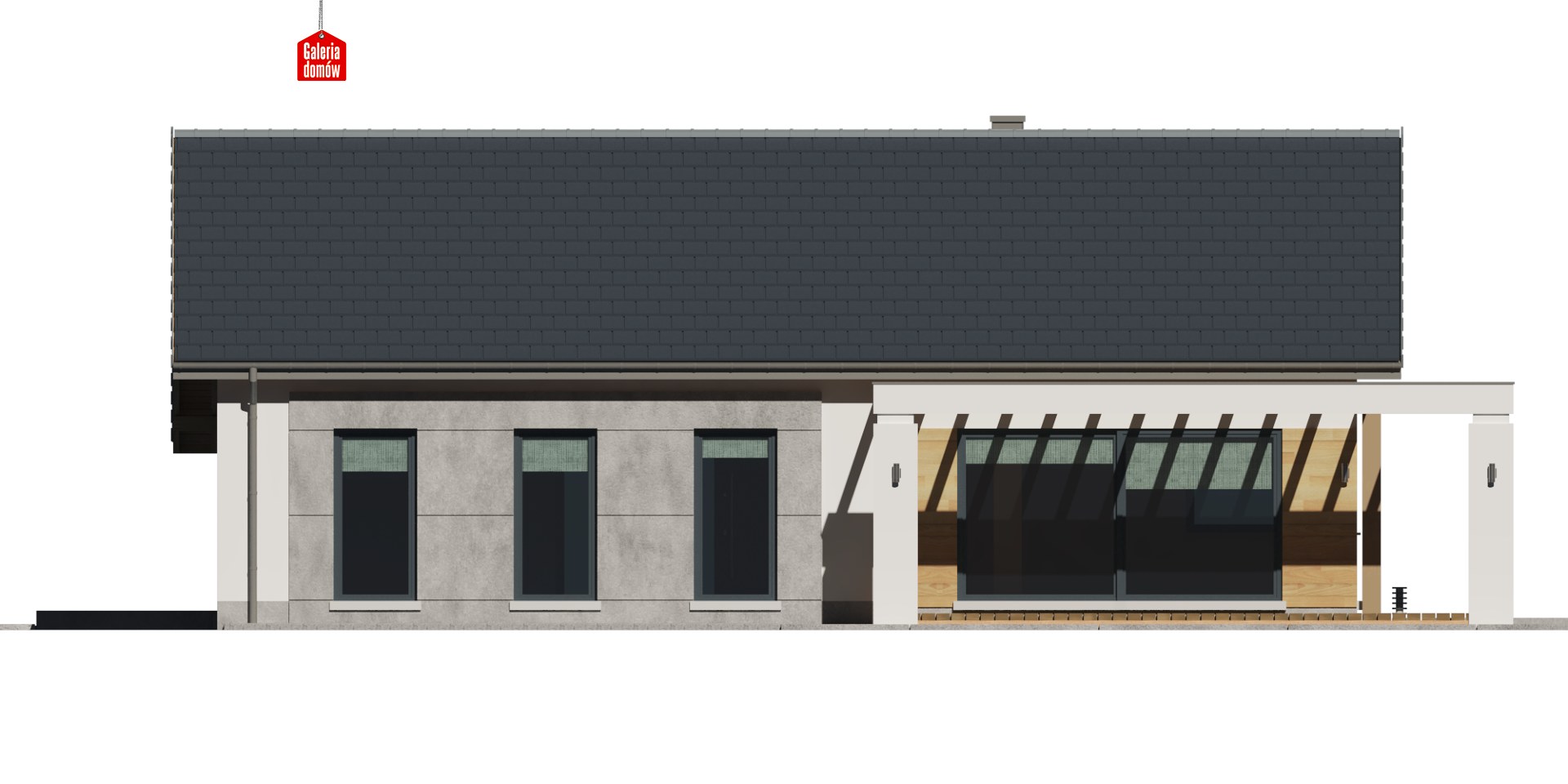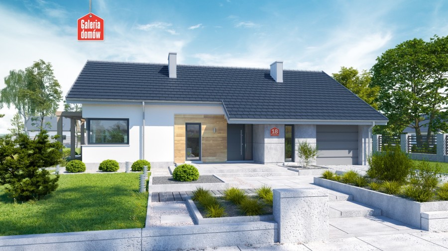 Nowoczesny dom parterowy, będący ciekawą propozycją dla 4-osobowej rodziny. Prosta bryła czyni go szybkim i tanim w budowie. Parter podzielono wyraźnie na dwie strefy. Po zachodniej stronie znajduje się przestrzeń dzienna składająca się z salonu i kuchni. Efektownie zaaranżowany taras, z nowoczesną pergolą, stanowi naturalne przedłużenie salonu i jest doskonałym miejscem do spędzania czasu w ciepłe, słoneczne dni. Kuchnia jest doskonale doświetlona poprzez zastosowanie narożnego, panoramicznego okna. Północno-wschodnią część budynku zajmują 3 sypialnie. Miejscem łączącym strefę codziennych aktywności od przestrzeni wypoczynku jest duża łazienka, z narożną wanną. Zaplecze gospodarcze Przyjemnej 18 stanowi duża kotłownia z kominem przygotowanym na dwa typy ogrzewania (gaz, paliwo stałe) oraz jednostanowiskowy garaż. Dom zaprojektowano w technologii murowanej, posiada aktualną charakterystykę energetyczną oraz dodatkowe projekty instalacji solarnej i wentylacji mechanicznej z rekuperacją.
