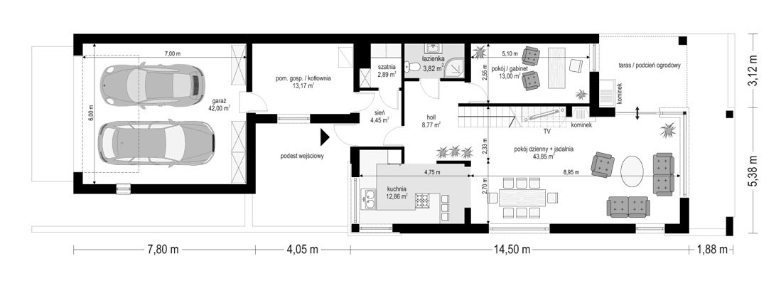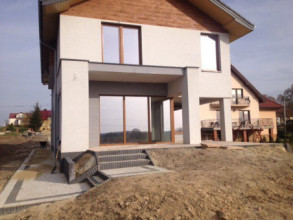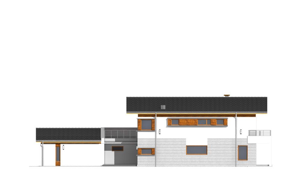 Dom w brzozach naprawdę zawraca uwagę już od zewnątrz. Fajny dwuspadowy dach dodaje mu myślę wysokości i delikatnie wysmukla ogólną sylwetkę domu. Niesamowite przeszklenia jeżeli chodzi o taras, myślę, że dużo światła przez to będzie dopływać do olbrzymiego i przestronnego salonu. Rzadko można spotkać projekty o takiej powierzchni części dziennej.