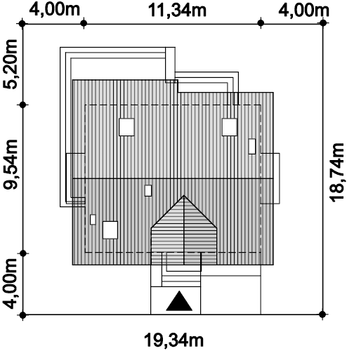 Drugi projekt z rodziny Feniks został dopasowany do lokalizacji, w których warunki zabudowy pozwalają na dach o kącie nachylenia 30°. Otwarty układ funkcjonalny zapewnia komfortowe warunki dla 4-osobowej rodziny, przy czym zachowano czytelny podział na strefy - dzienną i prywatną. Główna sypialnia została rozszerzona o garderobę i prywatną łazienkę. Zadaszone tarasy umożliwiają planowanie wypoczynku na świeżym powietrzu niezależnie od warunków atmosferycznych. Duża kotłownia umożliwia zaprojektowanie dowolnego systemu ogrzewania, a w razie potrzeby może służyć również jako dodatkowa przestrzeń gospodarczo-magazynowa. Uzupełnieniem programu funkcjonalnego jest 2-stanowiskowy garaż.Ściany: 2-warstwowe - pustak ceramiczny + styropian, Stropy: żelbetowe, wylewane, Dach: blacha na rąbek stojący Classic Ruukki, kąt nachylenia 30°