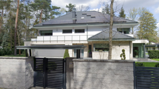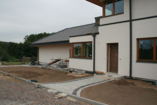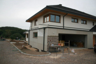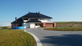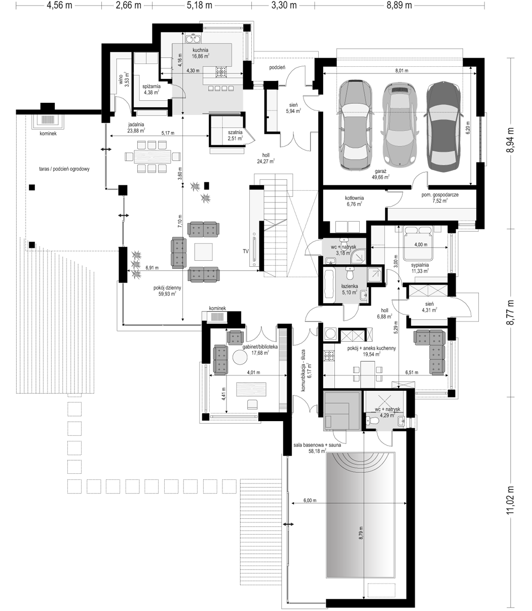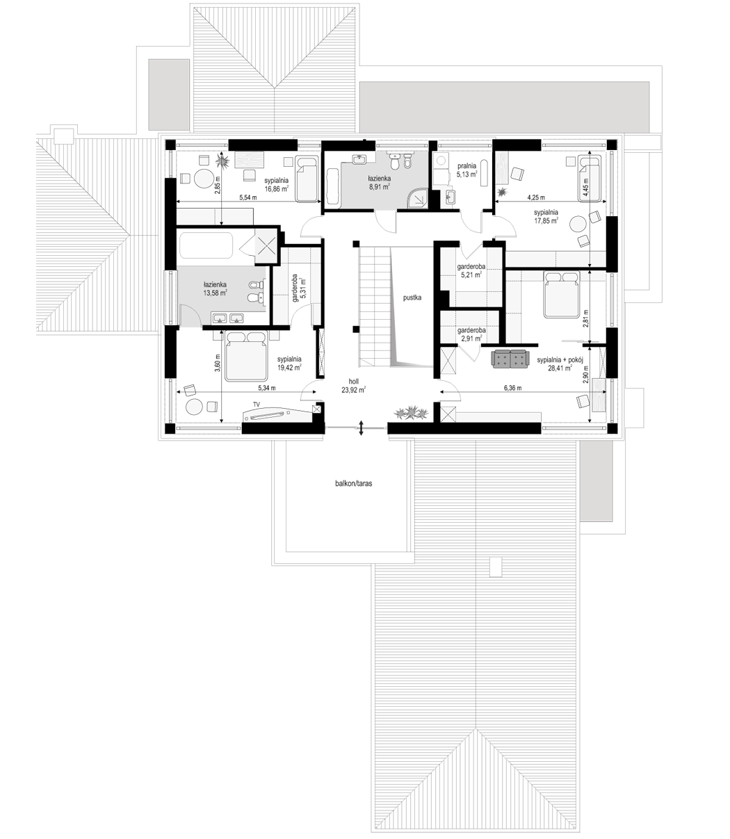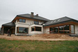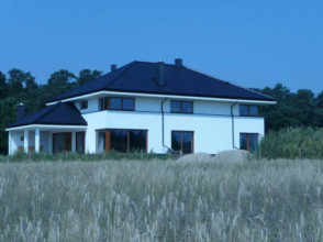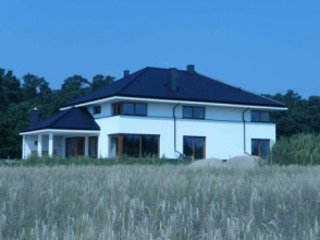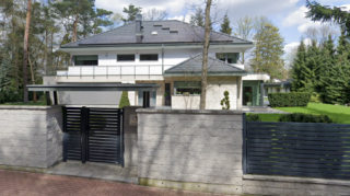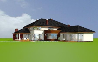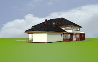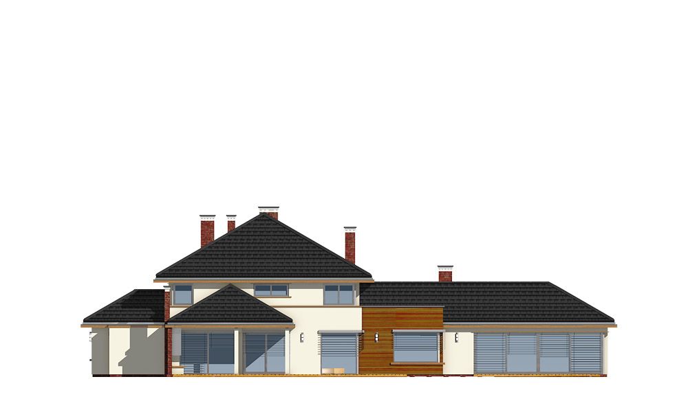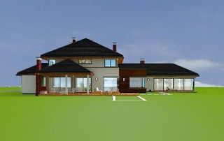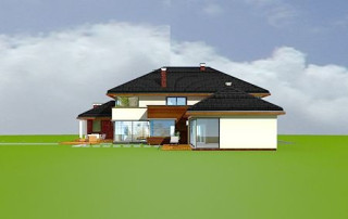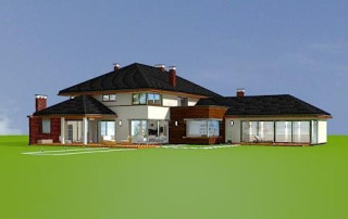 Projekt domu Willa z Basenem to obszerna rezydencja dla rodziny 4- 6-osobowej. Dom składa się ze zwartej, jednopiętrowej bryły przekrytej czterospadowym dachem, oraz dobudowanych dwóch brył parterowych, przekrytych wielospadowymi dachami. Budynek jest podmiejską willą o nowoczesnej, ale spokojnej architekturze. Ciekawa stylistyka domu z dobudowanym garażem, dużym zadaszonym podcieniem, oraz osobnym pomieszczeniem z tyłu willi, pełniącym funkcję wypoczynkową. Bryła budynku została ciekawie ozdobiona klinkierowymi i drewnianymi okładzinami elewacji, oraz loggiami i podcieniem wejściowym. Masywny ozdobny komin kominka wewnętrznego i zewnętrznego, czy narożne okna - to dodatkowe ozdoby domu. Na parterze przez szerokie przeszklenia z salonu zaplanowano wyjście do dużego podcienia i na taras ogrodowy. W projekcie Willa z Basenem wszystkie elementy elewacji tworzą spójną, spokojną kompozycyjnie całość. Pracownia posiada także wersję projektu Willa z Basenem w odbiciu lustrzanym.