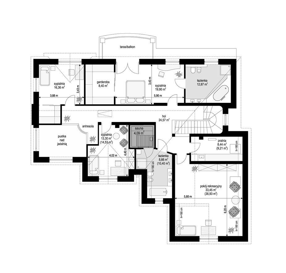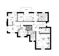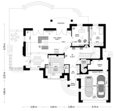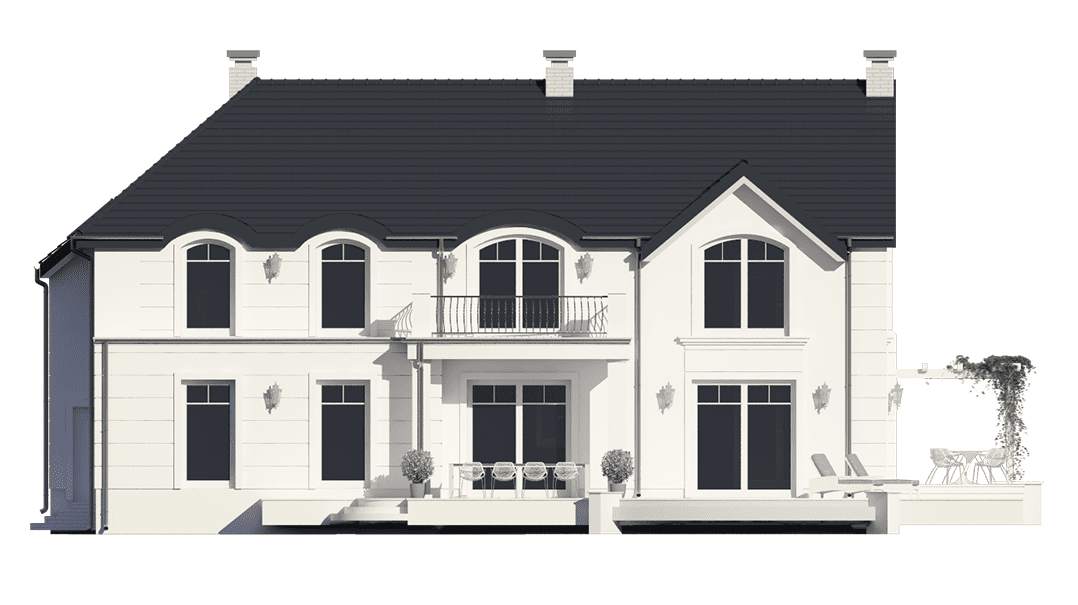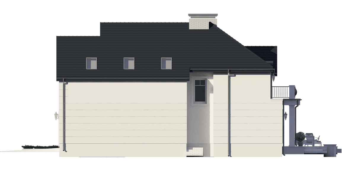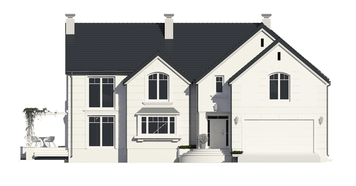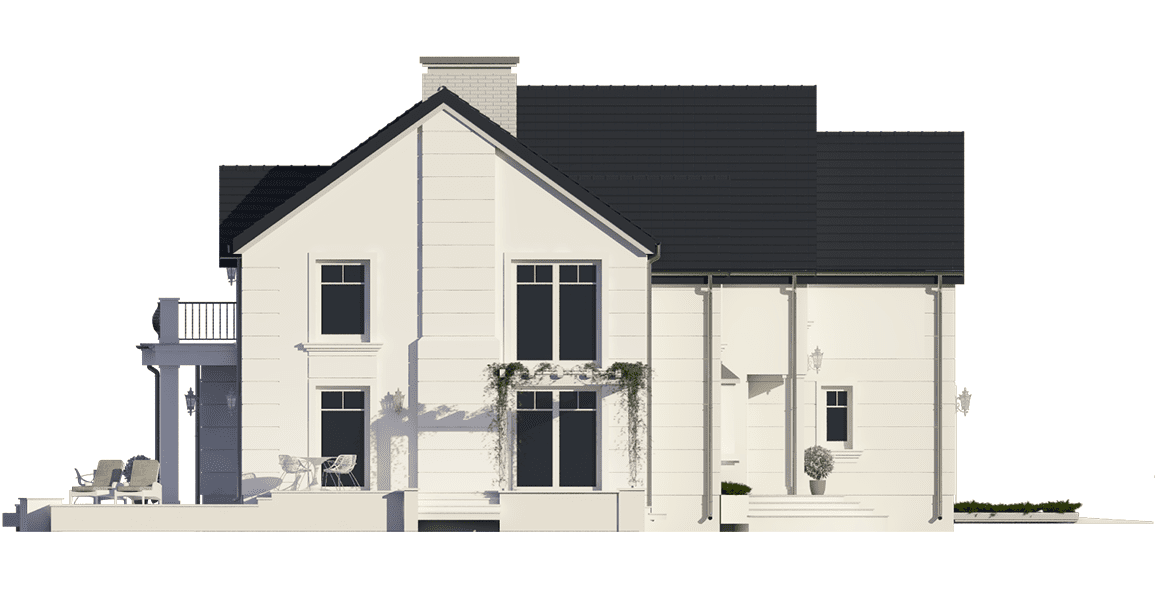 Dom z widokiem 5 to nowość z cieszącej się popularnością serii projektów „Dom z widokiem”, najmniejszy wariant tego projektu. Dom przy niewielkiej powierzchni i umiarkowanych kosztach budowy zawiera większość elementów i detali architektonicznych pierwotnego projektu, a jednocześnie ma wygodne i funkcjonalne wnętrze. Dom z widokiem 5 to budynek piętrowy, przykryty wielospadowym dachem. Jego główna bryła ma dach kopertowy. Do rdzenia domu dobudowano fragment piętrowy, oraz kilka parterowych części : nad garażem, kuchnią czy nad zadaszeniem tarasu. Całość sylwetki domu to jest atrakcyjna i nowoczesna, ozdobiona ciekawymi detalami, kamiennymi okładzinami ścian i dużymi przeszkleniami otwierającymi wnętrze na ogród. Wejście do domu zaakcentowano narożnym podcieniem i szerokimi drzwiami z naś