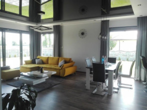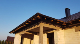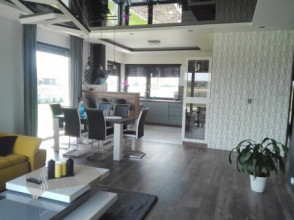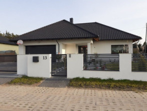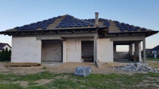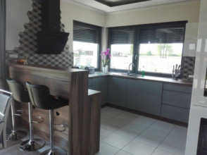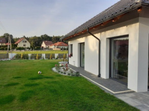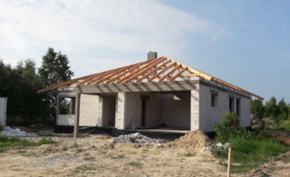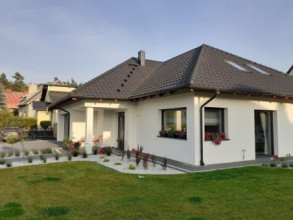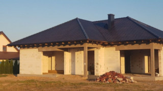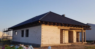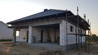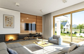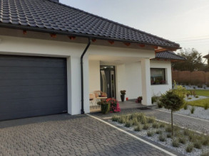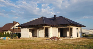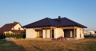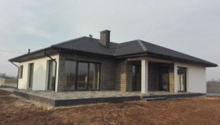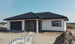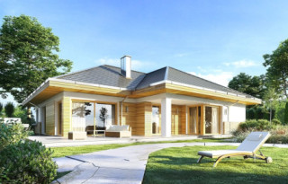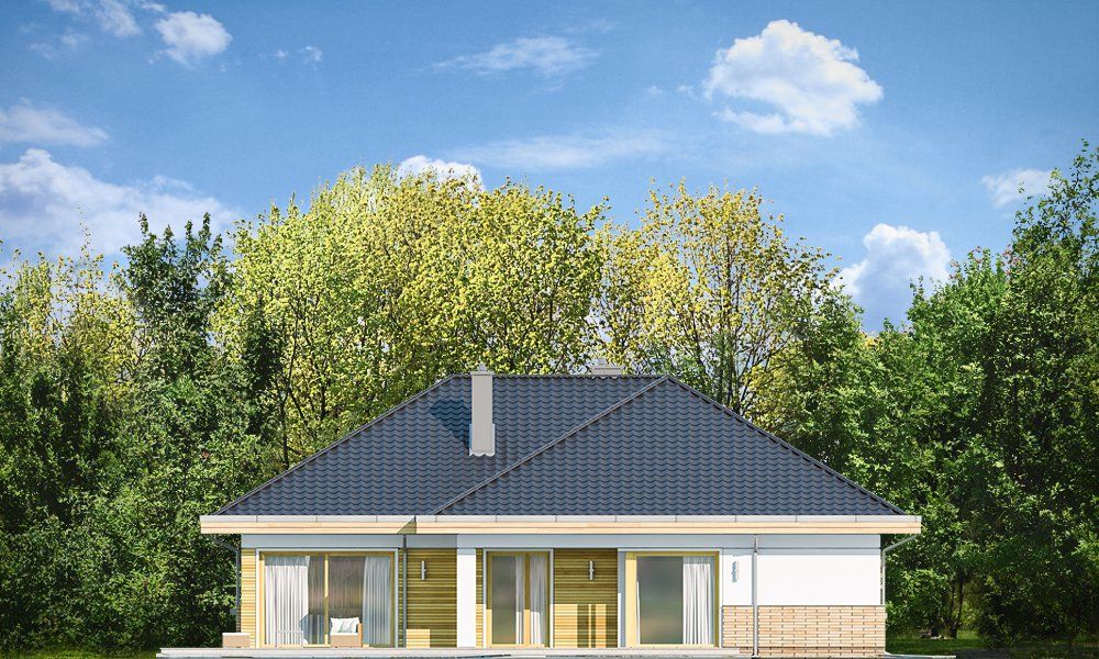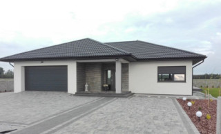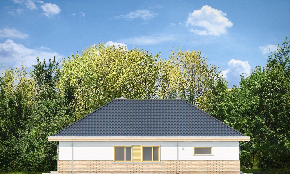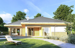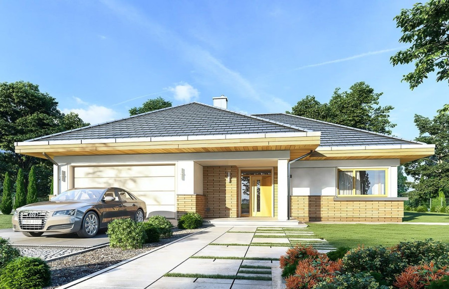 Projekt domu Doskonały 2 jest wersją wariantową projektu parterowego domku jednorodzinnego „Doskonały”. Projekt przeznaczony jest dla 4- 5-osobowej rodziny. Od podstawowego modelu różni się wyższym dachem, a co za tym idzie większym strychem, który może zostać adaptowany na poddasze. Domek zaprojektowano jako rozłożystą parterową bryłę zbudowaną na planie litery T, z garażem i podcieniem wejściowym od frontu, oraz podcieniem ogrodowym przykrywającym taras od strony elewacji tylnej. Duże przeszklenia okien, okładziny klinkierowe ścian, i fragmenty elewacji wykończone drewnem nadają bryle przekrytej wielospadowym dachem dodatkowej atrakcyjności. Szerokie okapy z drewnianą podbitką i trzema warstwami deski okapowej z krytą rynną wyróżniają dom oryginalnym detalem. Front domu ujmuje swoją dostojnością i reprezentacyjnym lookiem. Wejściowe drzwi z naświetlami zapraszają do wnętrza. Z kolei elewacja ogrodowa uwodzi szerokimi narożnymi przeszkleniami otwierającymi wnętrze domu na ogród. Wnętrze zaprojektowano na jednym poziomie - wszystkie potrzebne pomieszczenia znajdują się na parterze. Strych możliwy do zaadaptowania na dodatkowe poddasze stanowi możliwą opcję - dodatek do i tak pięknego wnętrza na parterze. Z wygodnego przedsionka dostajemy się do holu i dalej do salonu. Możemy też przejść w bok do kotłowni i garażu, oraz dostać się do spiżarni, a przez nią do kuchni. Takie połączenie ułatwia codzienny transport zakupów domowych. Salon otwarty na taras i ogród szerokim narożnym przeszkleniem łączy w sobie strefę wypoczynkową z kominkiem i ścianą TV i jadalnię, połączoną z ładną kuchnią. W strefie prywatnej domowników mamy sypialnię rodziców z garderobą i niewielką łazienką z prysznicem, dodatkowy pokój - np. gabinet, dwie sypialnie dzieci z szafami w zabudowie, oraz dużą łazienkę i wc dostępne z holu. Z holu wchodzimy też schodami na strych, który można zaadaptować na dodatkowe poddasze. „Doskonały 2” ma stosunkowo prostą konstrukcję. Dom jest niedrogi w budowie i późniejszym utrzymaniu. Do świetna propozycja dla osób marzących o parterowym wygodnym domu. Zapraszamy do zapoznania się z pełną ofertą pracowni MG Projekt: Doskonały i Doskonały 2 B.
