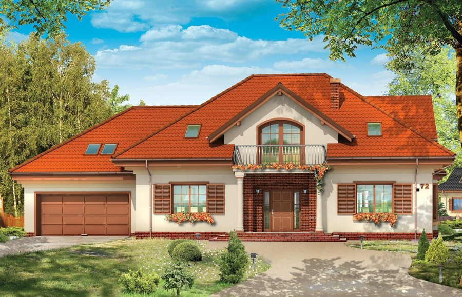 Projekt domu Benedykt 5 to kolejna odsłona popularnego projektu Benedykt. Od wersji podstawowej projektu różni się podwójnym garażem, trzema lukarnami na poddaszu, wychodzącymi na każdą stronę budynku, oraz dodatkowo: wejściem kolumnowym z balkonikiem, oraz wykuszem w jadalni. W projekcie Benedykt 5, dzięki powiększeniu części garażowej i przeniesieniu kotłowni uzyskano dodatkowy pokój na parterze. Na poddaszu, nad garażem zaprojektowano dużą część rekreacyjną. Poddasze jest większe, niż w wersji podstawowej projektu, dzięki zwiększeniu wysokości ścian kolankowych. Pracownia posiada również odbicie lustrzane projektu Benedykt 5. Zapraszamy do zapoznania się z pełną ofertą pracowni MG Projekt: projekt domu Benedykt, projekt domu Benedykt 2, projekt domu Benedykt 3, projekt domu Benedykt 4, projekt domu Benedykt 5, projekt domu Benedykt Bliźniak.