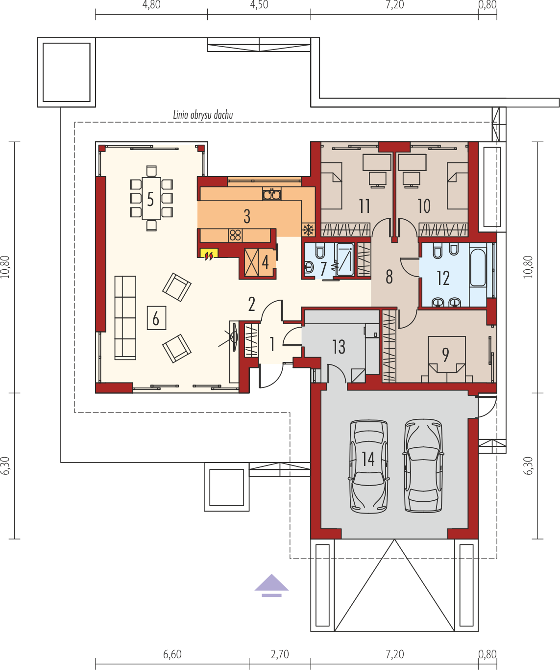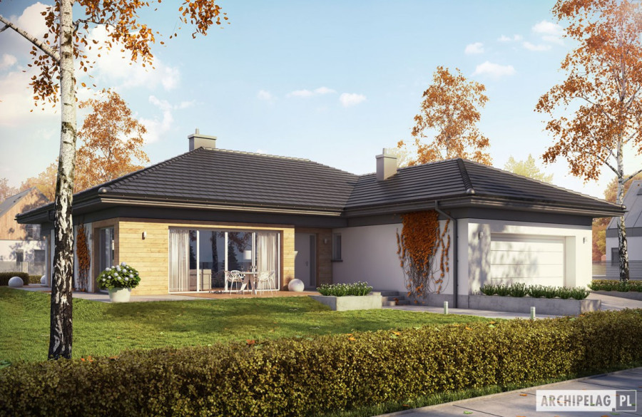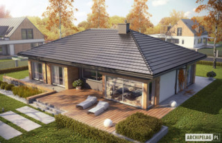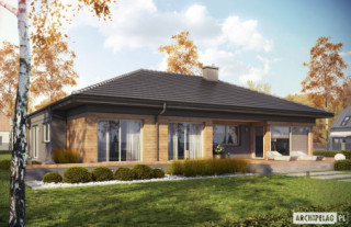 Charakterystyka: dom parterowy, niepodpiwniczony, z garażem dwustanowiskowymPrzeznaczenie: dom dla 4-osobowej rodzinyTechnologia i konstrukcja:Fundamenty: ławy, bloczki betonowe 24 cm, ocieplenie styropian 15 cmŚciany zewnętrzne: murowane, dwuwarstwowe, beton komórkowy 24 cm, ocieplenie 20 cmŚciany wewnętrzne: murowane, ściany nośne 24 cm, ścianki działowe 12 cmPodłoga na gruncie: płyta betonowa, ocieplenie styropian 15 cmStrop: strop gęstożebrowy TerivaDach: konstrukcja drewniana, ocieplenie wełna mineralna 30 cm, dachówka płaska Bergamo firmy RöbenRozwiązania instalacyjne: Ogrzewanie: kocioł gazowy, rozprowadzenie ciepła: grzejniki Wentylacja: grawitacyjna Wykończenie:Elewacja: tynk cienkowarstwowy mineralny w kolorze TO-PA001 z palety firmy Termo Organika i okładzina drewnianaStolarka: drewniana, PCV lub aluminiowaWersje - zapytaj o dostępność:- Dominik - bez garażu i z garażem jednostanowiskowym- Dominik G2 (wersja B) - inne wykończenie elewacji- Odbicia lustrzane do wszystkich wersjiIstnieje techniczna możliwość:- zmiany kąta nachylenia dachu do 30º Atuty projektu okiem architekta:- Nowoczesny design- Perfekcyjnie rozplanowane wnętrze- Kuchnia z praktyczną spiżarnią- Reprezentacyjny salon z kominkiem oferujący wiele możliwości aranżacji- Funkcjonalne szafy wnękowe- Duże przeszklenia od strony salonu i jadalni- Częściowo zadaszony taras- Wygodne zadaszenie nad wejściem do budynku jako osłona przed wiatrem i śniegiem- Modna kompozycja elewacji- Przestronna strefa gospodarcza- Duże pomieszczenie kotłowni pozwala na zastosowanie dowolnego źródła ogrzewania