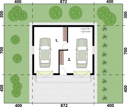 Garaż dwustanowiskowy.Brama garażowa o wymiarach 2,4x2,2m. Projekt garażu składa się z czterech egzemplarzy a w tym części architektonicznej, konstrukcyjnej i instalacji wewnętrznej elektrycznej. W projekcie załączone są podstawowe zestawienie stali, drewna i stolarki okienno-drzwiowej. Do projektu dołączamy bezpłatną zgodę na wprowadzenie zmian, oświadczenie projektantów o wykonaniu projektu zgodnie z obowiązującymi normami i przepisami oraz kserokopie uprawnień projektantów wraz z aktualnym wpisem do izby.