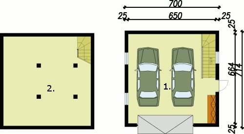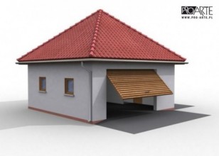Garaż dwustanowiskowy, wolnostojący, podpiwniczony ze strychem. Brama garażowa o wymiarach 4200x2600.