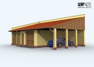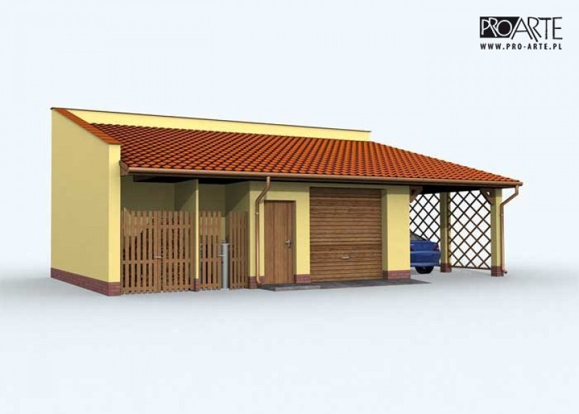 Projekt garażu jednostanowiskowego z pom. gospodarczymi i wiatą garażową. Projekt garażu składa się z czterech egzemplarzy a w tym części architektonicznej, konstrukcyjnej i instalacji wewnętrznej elektrycznej. W projekcie załączone są podstawowe zestawienie stali, drewna i stolarki okienno-drzwiowej. Do projektu dołączamy bezpłatną zgodę na wprowadzenie zmian, oświadczenie projektantów o wykonaniu projektu zgodnie z obowiązującymi normami i przepisami oraz kserokopie uprawnień projektantów wraz z aktualnym wpisem do izby.