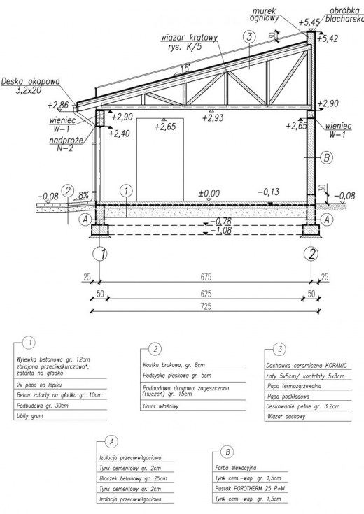 Garaż trzystanowiskowy z pomieszczeniem gospodarczym.Bramy garażowe o wymiarach 5,0x2,4m i 2,4x2,4m.Projekt garażu składa się z czterech egzemplarzy a w tym części architektonicznej, konstrukcyjnej i instalacji wewnętrznej elektrycznej. W projekcie załączone są podstawowe zestawienie stali, drewna i stolarki okienno-drzwiowej. Do projektu dołączamy bezpłatną zgodę na wprowadzenie zmian, oświadczenie projektantów o wykonaniu projektu zgodnie z obowiązującymi normami i przepisami oraz kserokopie uprawnień projektantów wraz z aktualnym wpisem do izby.