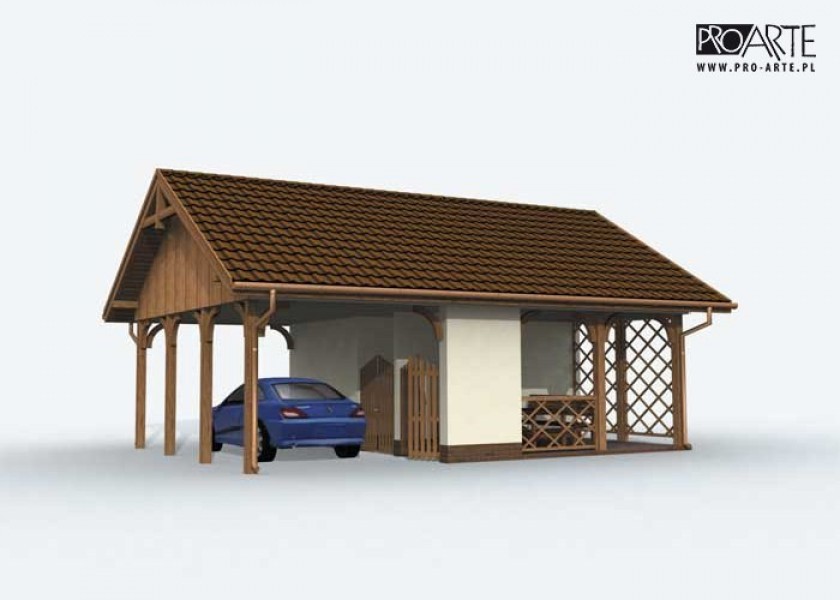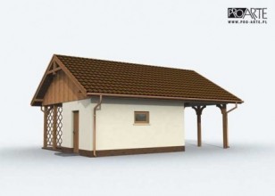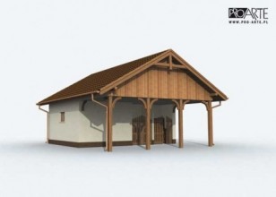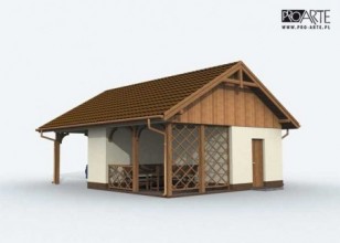 Wiata garażowa wolnostojąca, parterowa z pomieszczeniem gospodarczym, werandą,składem na odpady i drewno kominkowe. Projekt budynku składa się z czterech egzemplarzy a w tym części architektonicznej, konstrukcyjnej i instalacji wewnętrznej elektrycznej. W projekcie załączone są podstawowe zestawienie stali, drewna i stolarki okienno-drzwiowej. Do projektu dołączamy bezpłatną zgodę na wprowadzenie zmian, oświadczenie projektantów o wykonaniu projektu zgodnie z obowiązującymi normami i przepisami oraz kserokopie uprawnień projektantów wraz z aktualnym wpisem do izby.