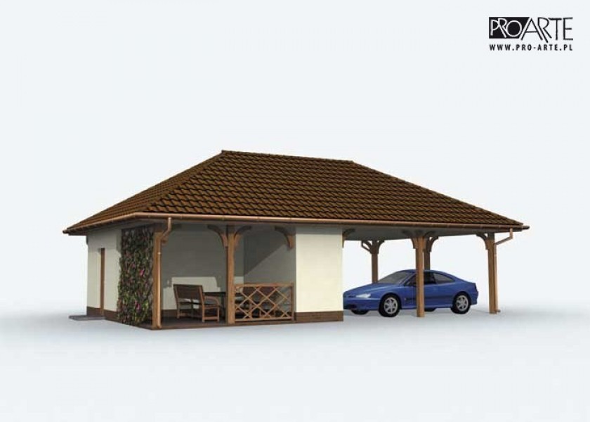 Wiata garażowa dwustanowiskowa wolnostojąca, parterowa z pomieszczeniem gospodarczym, werandą, składem na odpady i drewno kominkowe. Projekt budynku składa się z czterech egzemplarzy a w tym części architektonicznej, konstrukcyjnej i instalacji wewnętrznej elektrycznej. W projekcie załączone są podstawowe zestawienie stali, drewna i stolarki okienno-drzwiowej. Do projektu dołączamy bezpłatną zgodę na wprowadzenie zmian, oświadczenie projektantów o wykonaniu projektu zgodnie z obowiązującymi normami i przepisami oraz kserokopie uprawnień projektantów wraz z aktualnym wpisem do izby.