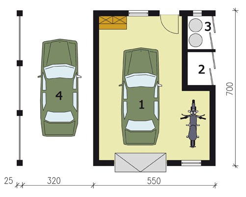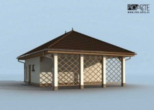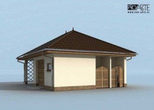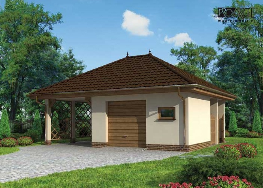 Garaż jednostanowiskowy ze składem na drewno i odpady oraz wiatą.