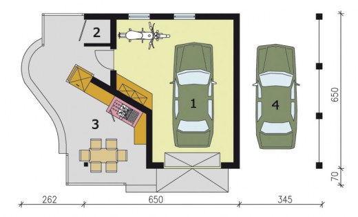 Garaż dwustanowiskowy ze składem na drewno kominkowe, werandą oraz wędzarnikiem.