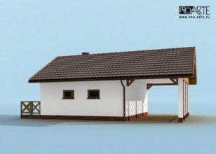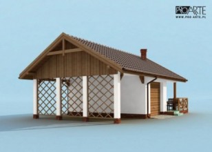 Garaż jednostanowiskowy z składem na drewno, werandą i wiatą garażową w technologii szkieletowej, wolnostojący, parterowy. Budynek posiada bramę garażową o wymiarach 2400x2400.Zobacz garaż w wersjii murowanej.Projekt budynku składa się z 6 egzemplarzy, a w tym 3 tomów części architektoniczno-budowlanej oraz 3 technicznej. W projekcie załączone są podstawowe zestawienie stali, drewna i stolarki okienno-drzwiowej. Do projektu dołączamy bezpłatną zgodę na wprowadzenie zmian, oświadczenie projektantów o wykonaniu projektu zgodnie z obowiązującymi normami i przepisami oraz kserokopie uprawnień projektantów wraz z aktualnym wpisem do izby. W przypadku zamówienia projektu w technologii lekkiej, drewnianej konstrukcji szkieletowej, powierzchnia użytkowa budynku jest o około 7% większa.