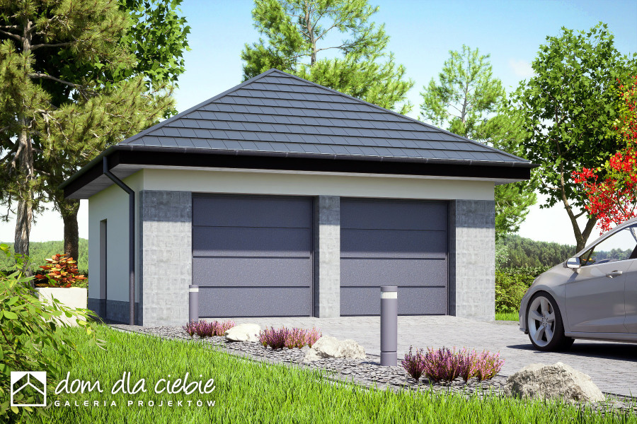 Wolno stojący garaż dwustanowiskowy, zaprojektowany w technologii murowanej z betonu komórkowego z dachem o konstrukcji drewnianej pokrytym dachówką ceramiczną lub cementową. Wysokość użytkowa 2,9 cm. Bramy wjazdowe zaprojektowano jako podnoszone o wym. 2,4 m x 2,2 m. Wykończenia: tynk akrylowy, podmurówka wykończona tynkiem mozaikowym.