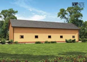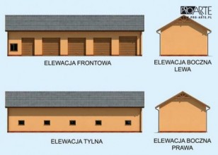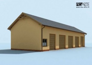 Garaż pięciostanowiskowy.Jedna brama garażowa o wymiarach 3,5x3,8m, trzy bramy o wymiarach 3,5x3,5m oraz jedna brama o wymiarach 2,5x3,5m.Projekt garażu składa się z czterech egzemplarzy a w tym części architektonicznej, konstrukcyjnej i instalacji wewnętrznej elektrycznej. W projekcie załączone są podstawowe zestawienie stali, drewna i stolarki okienno-drzwiowej. Do projektu dołączamy bezpłatną zgodę na wprowadzenie zmian, oświadczenie projektantów o wykonaniu projektu zgodnie z obowiązującymi normami i przepisami oraz kserokopie uprawnień projektantów wraz z aktualnym wpisem do izby.